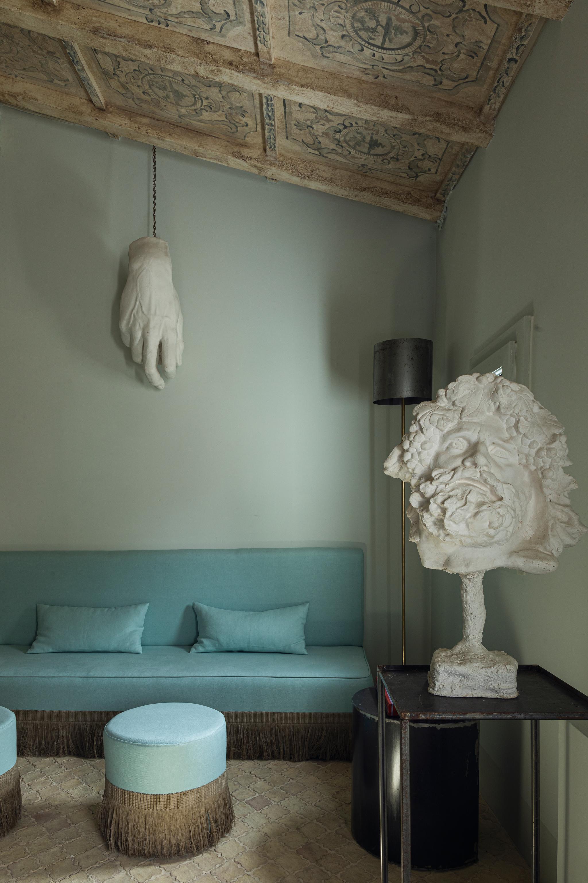 Dioniso invite à la chaleur et à l'émotion. La suite s'ouvre sur une sculpture du dieu du vin, donnant le ton d'un espace où les éléments classiques se mêlent à des tons doux de rose et de bleu et à un design contemporain polyvalent. C'est un espace intime et romantique, étagé mais léger.