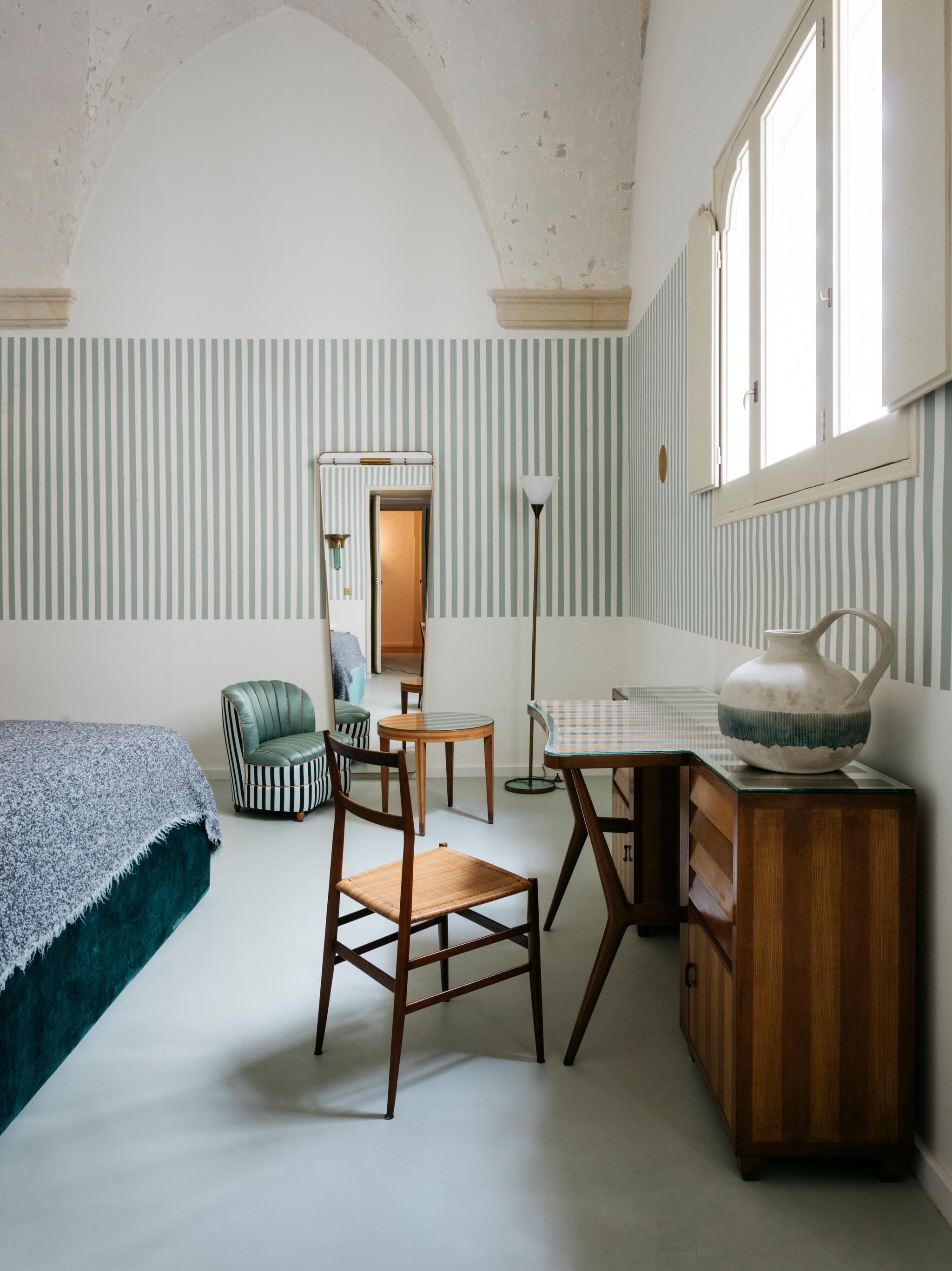 Anna Maria Enselmi a transformé le bâtiment historique en une résidence pleine d'art et de design, inspirée par l'héritage moderniste de Gio Ponti. L'hôtel est parsemé d'une étonnante collection de meubles de Ponti, en dialogue avec d'autres icônes du modernisme italien comme Franco Albini, Ettore Sottsass et Ignazio Gardella.