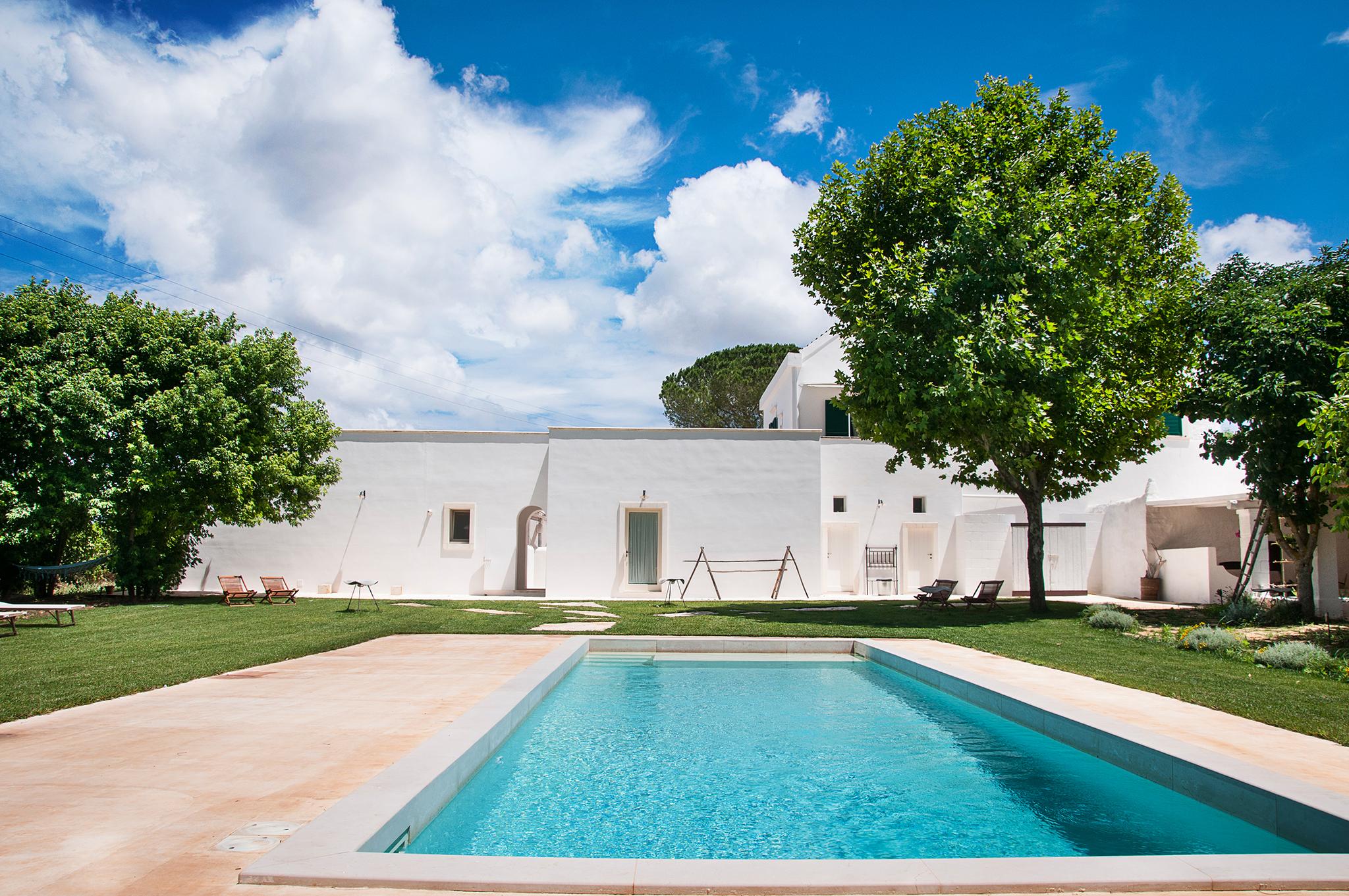 L'intérieur et l'extérieur de la masseria reflètent un mélange d'environnement rustique et moderne. Le patio vous accueille avec le jardin verdoyant, avec son jeu d'ombres et de lumières, un espace de vie extérieur parfait pour se détendre et lire. Dans le prolongement du patio se trouve la piscine qui se distingue dans le jardin bien entretenu.