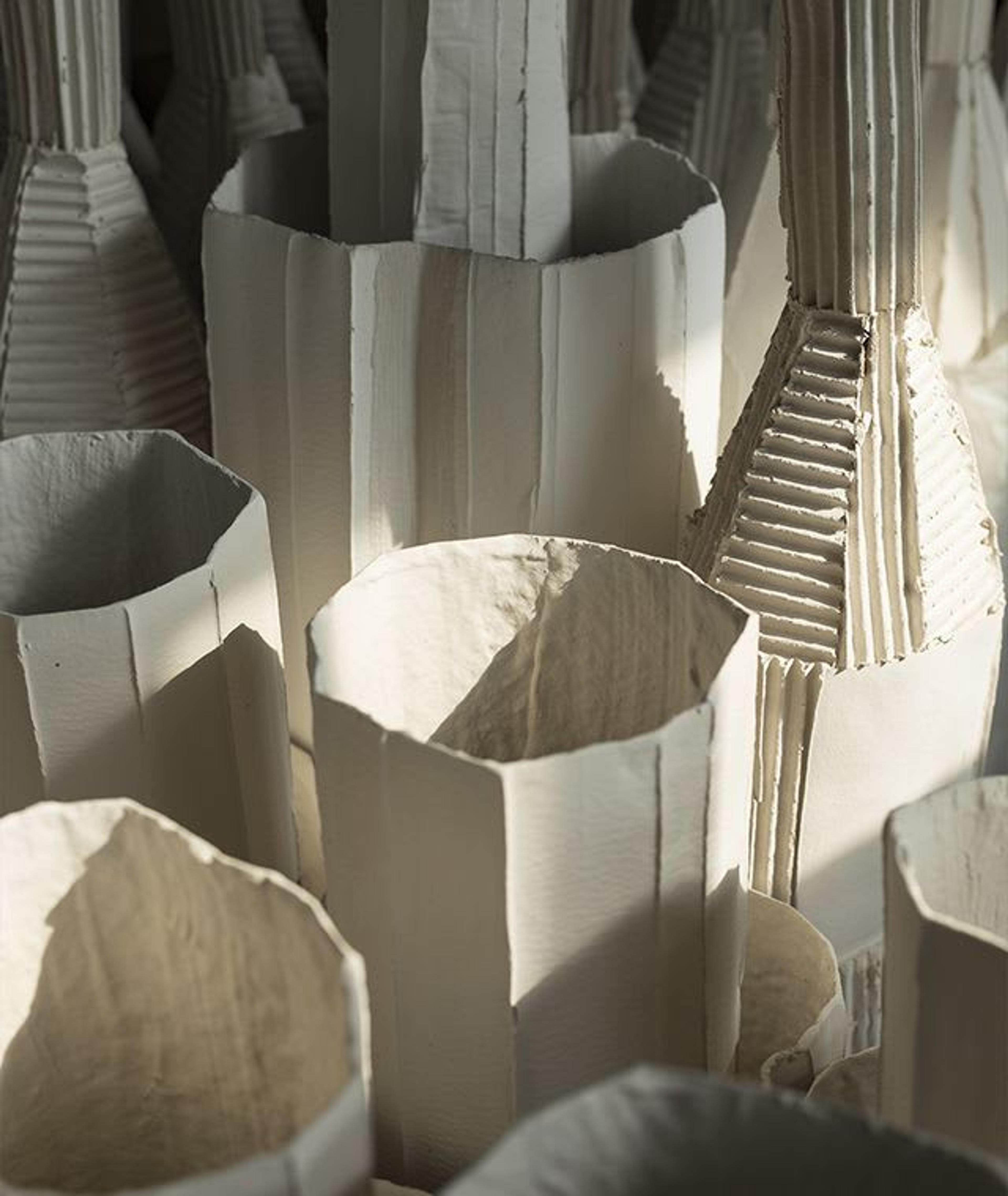 Je commence par un matériau simple, l'argile-papier, qui est créé en ajoutant différentes proportions de papier au mélange d'argile. En expérimentant avec les matériaux et en les poussant à leur limite, j'ai réinventé cette technique en la rendant complètement nouvelle et profondément mienne.