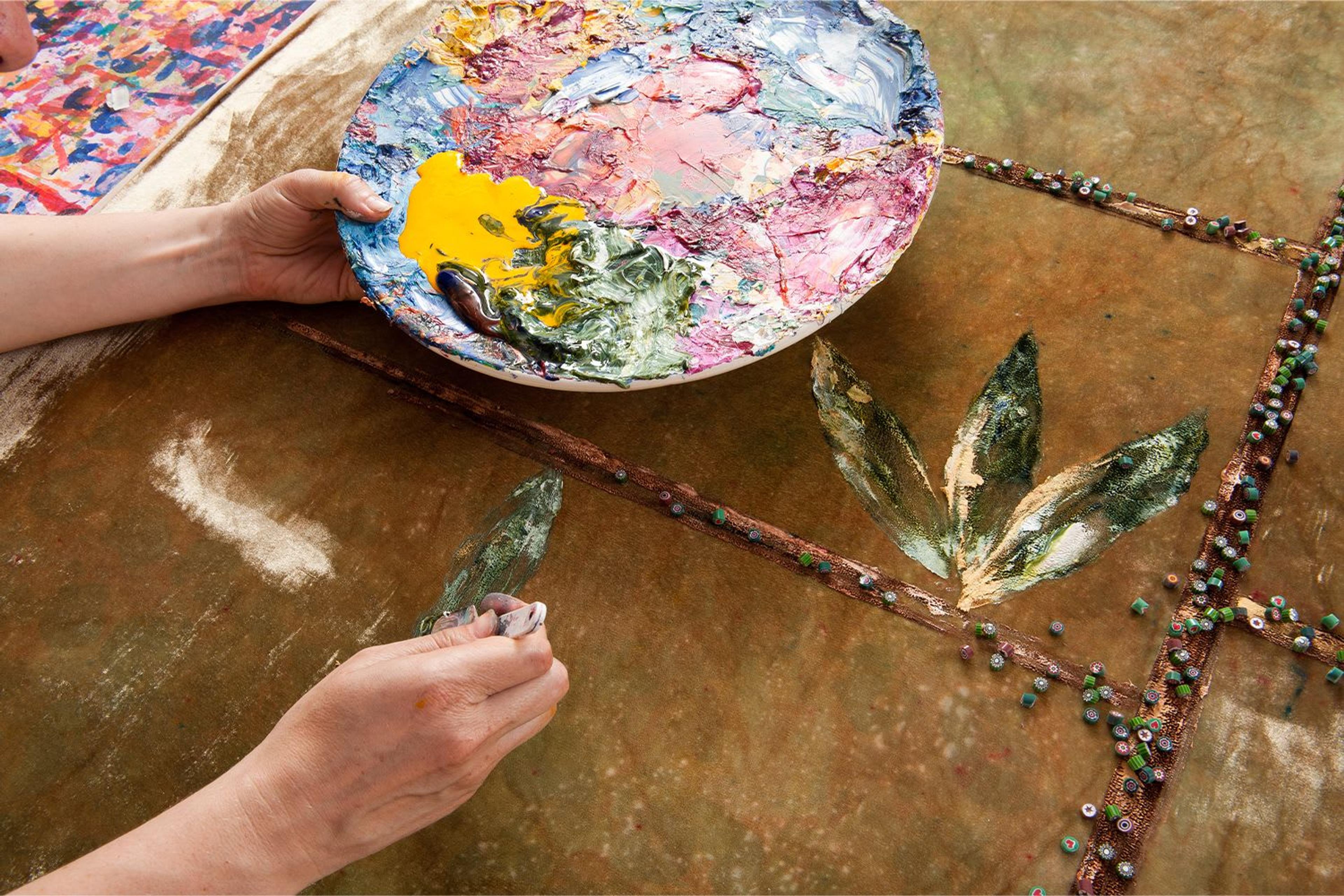 Tout d'abord, je prépare le velours et les teintures. Je prépare les pigments. En général, je n'ai même pas besoin de les essayer au préalable, car la bonne couleur est toujours immédiate. Il arrive rarement que la couleur ne ressorte pas comme je le voulais, et dans ce cas, j'abandonne temporairement et je recommence le lendemain. Ensuite, je plonge le velours dans l'eau et je le déplace en fonction de l'effet et de l'intensité que je veux obtenir. Ensuite, je le suspends et le laisse sécher longtemps avant de l'étirer et de le fixer sur la table pour commencer lentement à le peindre. Cette technique de peinture implique différentes couches et superpositions. L'image que j'avais préalablement pensée se transforme partiellement sur la surface de velours, prenant une forme instinctive. Ensuite, je la laisse sécher pendant au moins deux jours, puis je l'assemble ou la travaille directement selon qu'il s'agit d'une tapisserie, d'un paravent ou d'un coussin. Au tout dernier moment, j'ajoute du verre, des murrines ou des feuilles d'or.