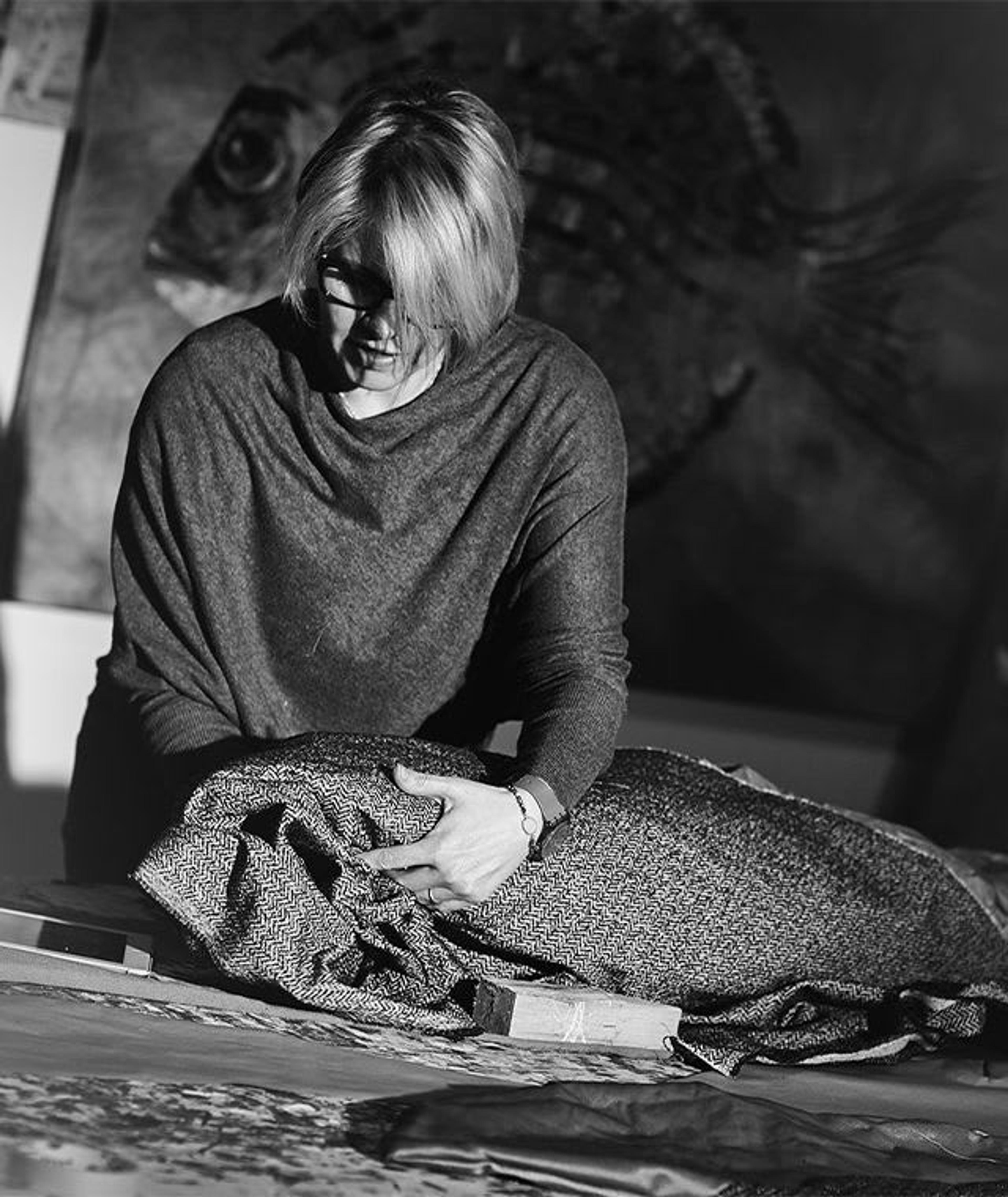Qu'est-ce qui vous fascine le plus dans ce matériau raffiné ? Je me suis inscrite à l'Institut d'art de Venise, dans la section tissage, et même si je savais que j'allais devoir travailler avec des tissus, je ne savais pas encore comment, jusqu'à ce que j'apprenne à teindre le velours : à ce moment-là, j'ai su que le velours allait être "Mon" tissu. Depuis lors, j'ai étudié l'histoire de la coloration et de l'impression sur les anciennes tapisseries vénitiennes, qui étaient réalisées à l'aide de blocs de bois. Après avoir perfectionné cette technique, j'ai réalisé qu'elle n'était pas suffisante pour exprimer toutes mes idées, et j'ai commencé à créer des outils de travail et des spatules que j'utiliserais ensuite pour imprimer la couleur sur le velours : c'est ainsi que j'ai conçu ma technique de peinture sur velours. Le velours ne peut être peint à l'aide de pinceaux souples, mes petits outils sont donc devenus des sortes de "pinceaux durs". Chaque fois que je teins du velours de soie blanc avec des couleurs, j'entre dans une atmosphère magique. Lorsqu'il est coloré, le velours de soie devient irisé, il joue avec la lumière, créant ou dissimulant parfois le dessin principal ou les détails en verre. Chaque fois que j'achève une œuvre, je crois que je viens de réaliser la première moitié de cette œuvre, car la seconde moitié est remplie par la lumière, lui conférant des reflets inattendus.