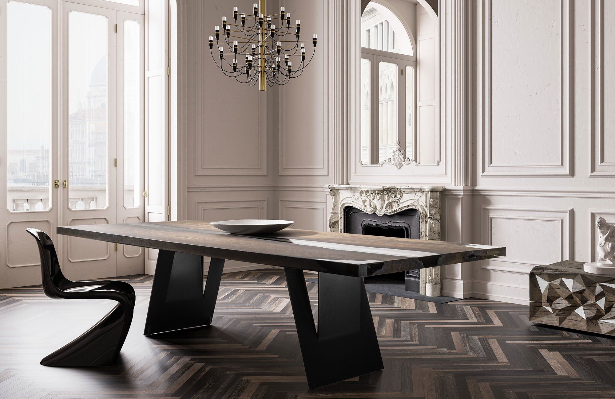 Nous sélectionnons les grumes directement à la source et nous supervisons toutes les étapes de la transformation : de la coupe à l'assaisonnement et au séchage, jusqu'au meuble fini. Je ne pense pas qu'il y ait beaucoup d'entreprises qui contrôlent toutes ces étapes dès le début. Souvent, un nouveau produit naît simplement en regardant le tronc ; on peut dire que nous tirons la pièce qui existe intrinsèquement dans le matériau. Les planches les plus remarquables révélées par le processus de coupe sont immédiatement numérotées et sélectionnées pour la production, de sorte que chaque table est réalisée à partir de sections provenant d'un seul tronc.