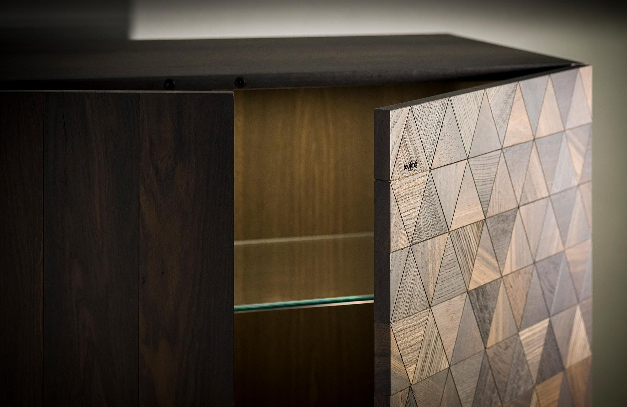 De nos jours, les machines à commande numérique par ordinateur sont sans aucun doute indispensables à toute production, mais certaines parties du travail requièrent la touche experte d'un artisan. Pour le buffet Trigono, la préparation des triangles des portes exige un travail minutieux de composition des couleurs, d'intersection des veines et de préparation de tous les joints d'assemblage. Ce travail n'a pu être réalisé sans l'aide d'artisans experts.