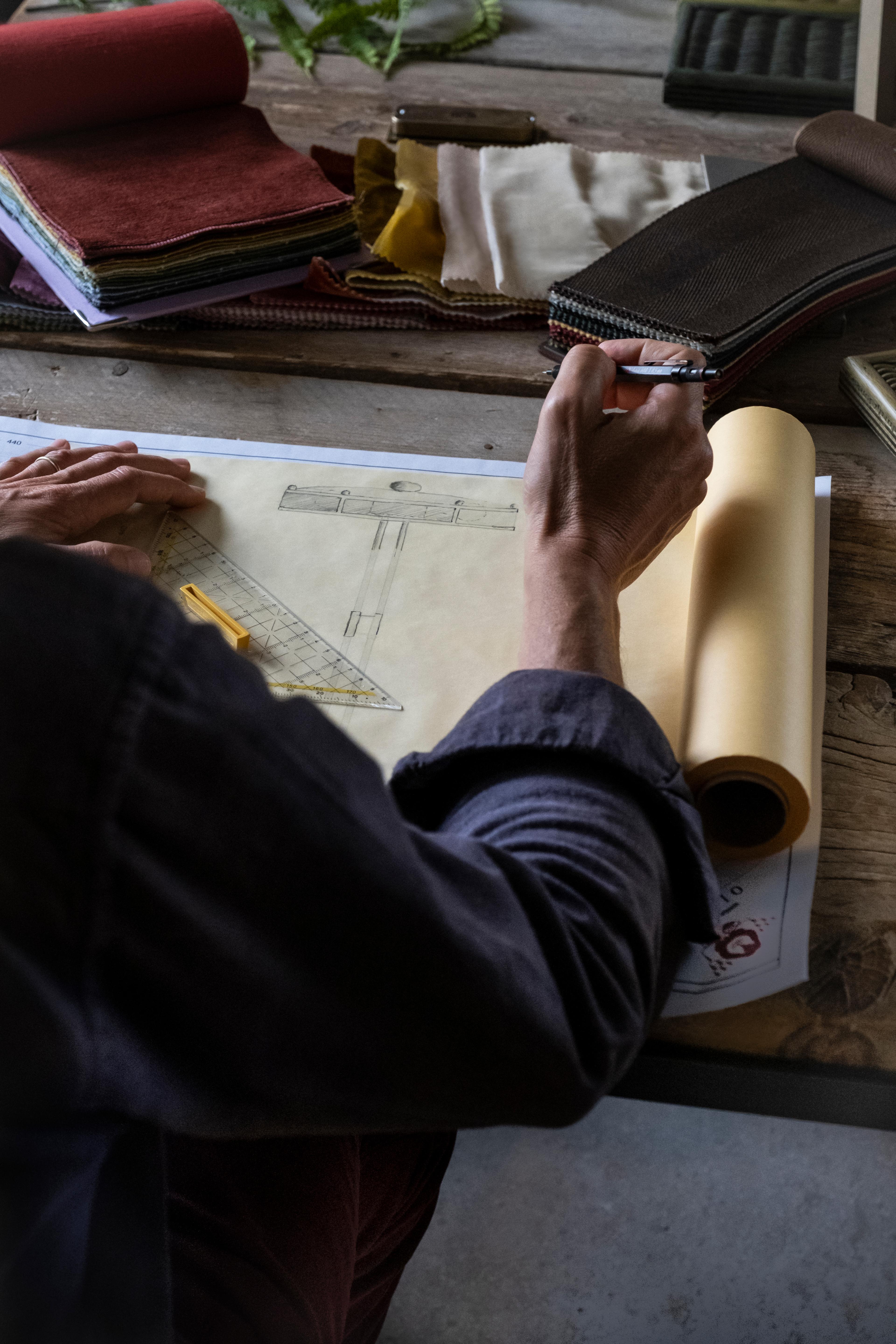 Tutti i progetti utilizzano materiali provenienti dall'Italia, la maggior parte nelle immediate vicinanze di Reschio. Questi vengono poi trasformati dai falegnami, fabbri, scalpellini e tappezzieri di Benedikt. L'Umbria possiede incredibili materiali locali, come la quercia antica, il travertino e il marmo, e chi vive qui conosce il modo migliore per lavorarli e utilizzarli. La maggior parte delle città collinari era rinomata per la specializzazione in uno specifico mestiere e oggi i loro discendenti lo praticano ancora con una conoscenza e una cura sorprendenti. A Reschio piace portare i suoi progetti agli specialisti, lavorare al loro fianco per creare un prototipo e poi vedere le loro precise competenze per realizzare la sua visione.