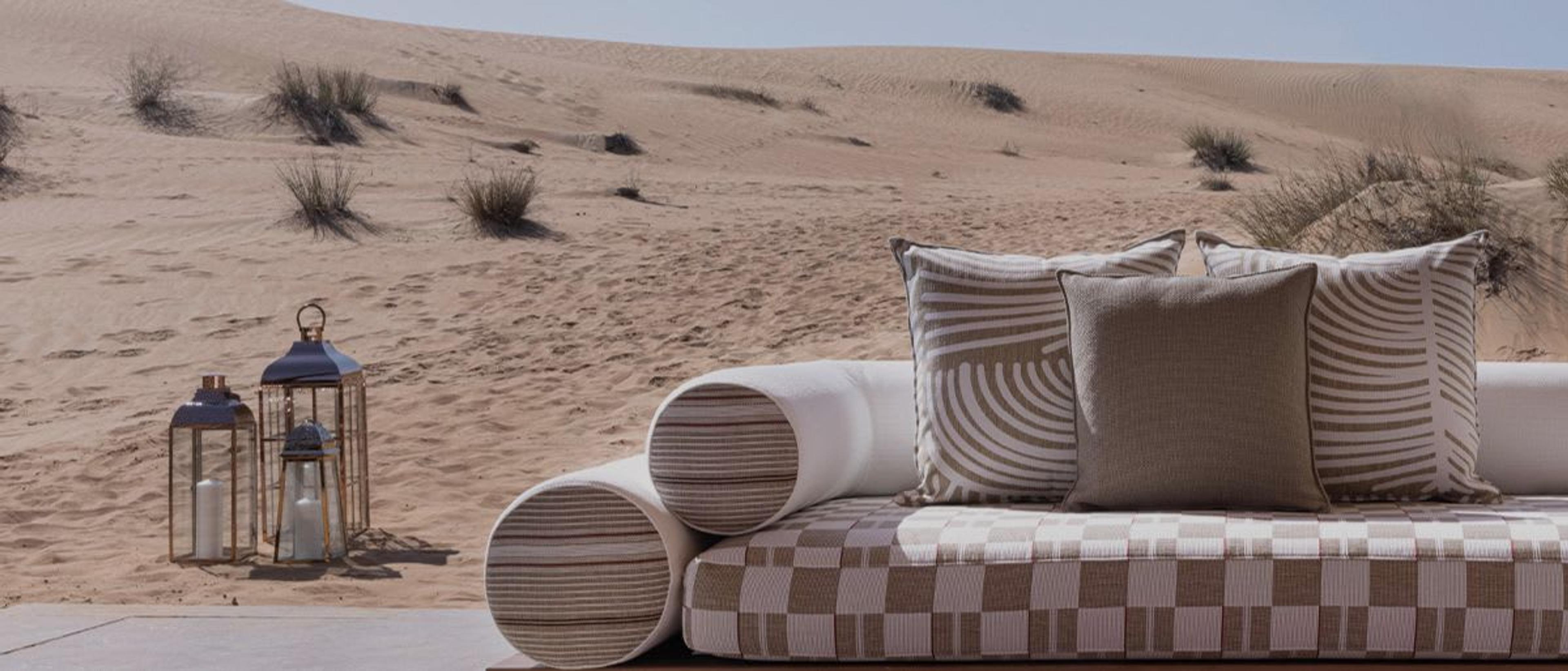 Ogni arredo è realizzato con materie prime d'eccellenza certificate per l'uso esterno, che garantiscono elevate prestazioni in termini di durata, oltre al massimo comfort d'uso. Il tratto distintivo fondamentale della collezione è l'esclusivo design tessile, ispirato all'arte tessile dei beduini, i Sadu, con raffinate palette di colori e sofisticate fantasie.