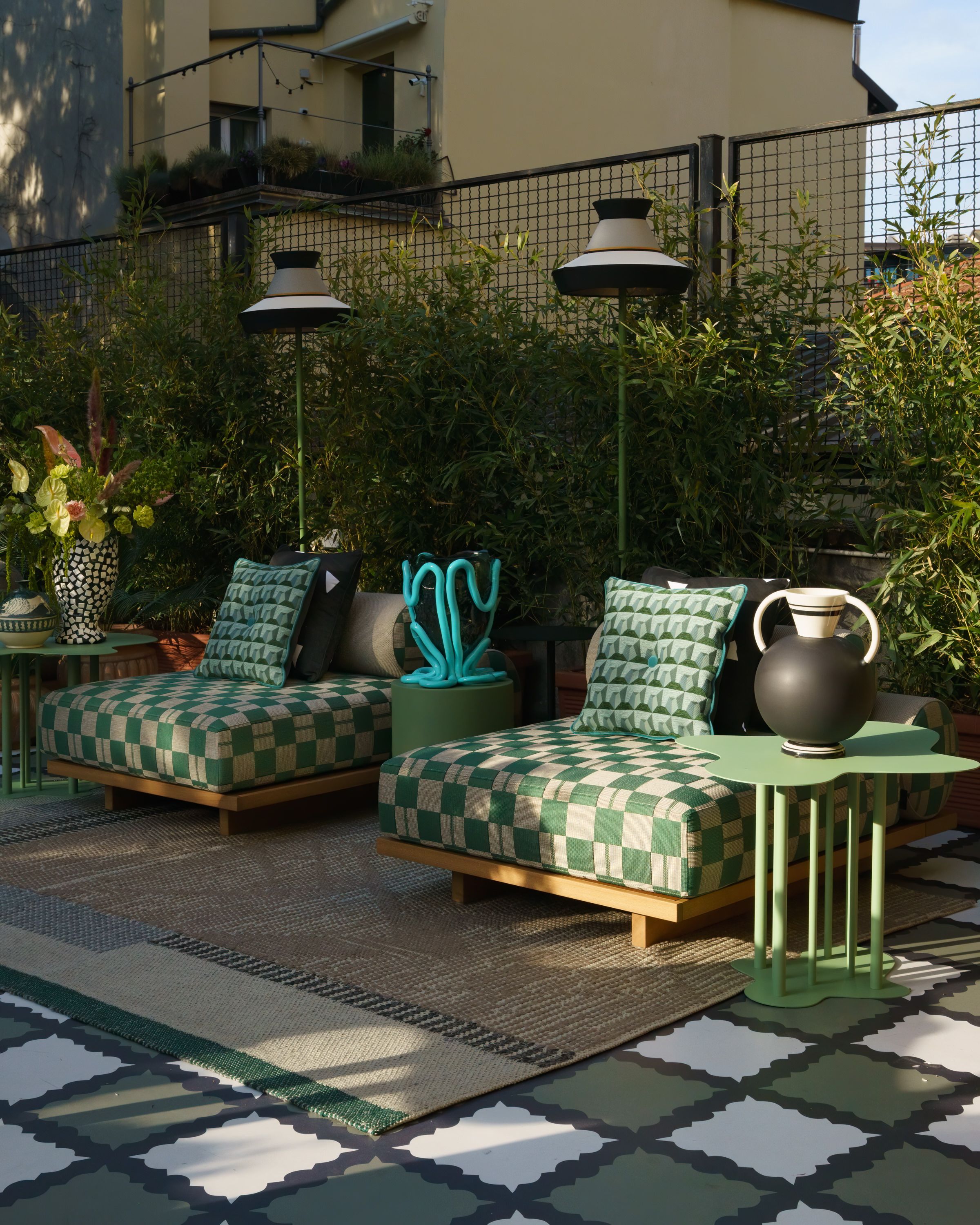 Attraverso la terrazza MONIOMI Design trasmette la propria estetica e visione creativa mettendo in risalto elementi fortemente integrati al linguaggio estetico e progettuale dello studio. L’uso di colori saturi e motivi stratificati, sono infatti una rappresentazione delle radici ispaniche di MONIOMI Design. Per la terrazza di L'Appartamento MONIOMI ha portato così uno scorcio di Miami in Italia. Un'atmosfera tropicale incontra l’alto artigianato italiano; un matrimonio perfetto per la terrazza de L'Appartamento.