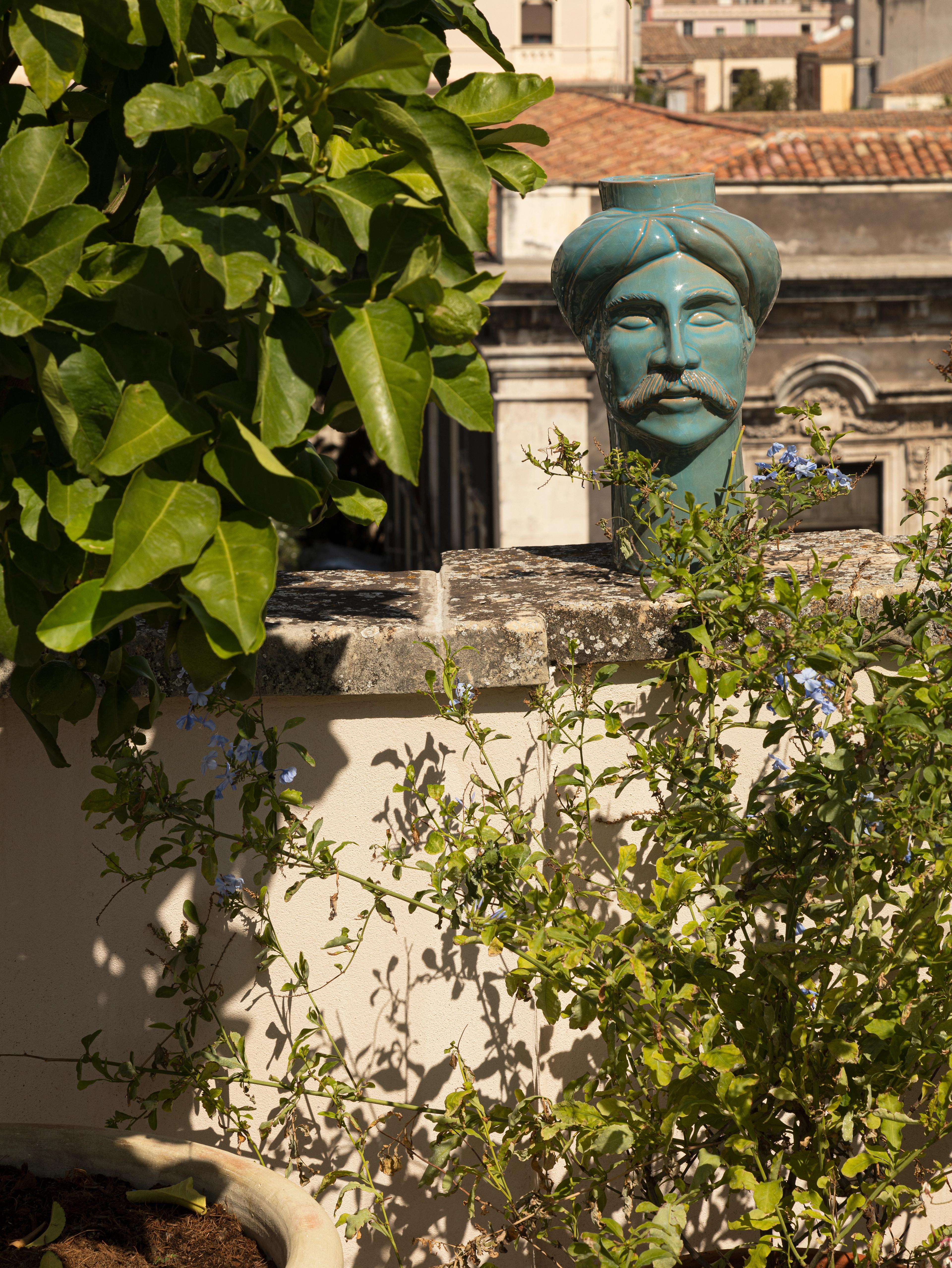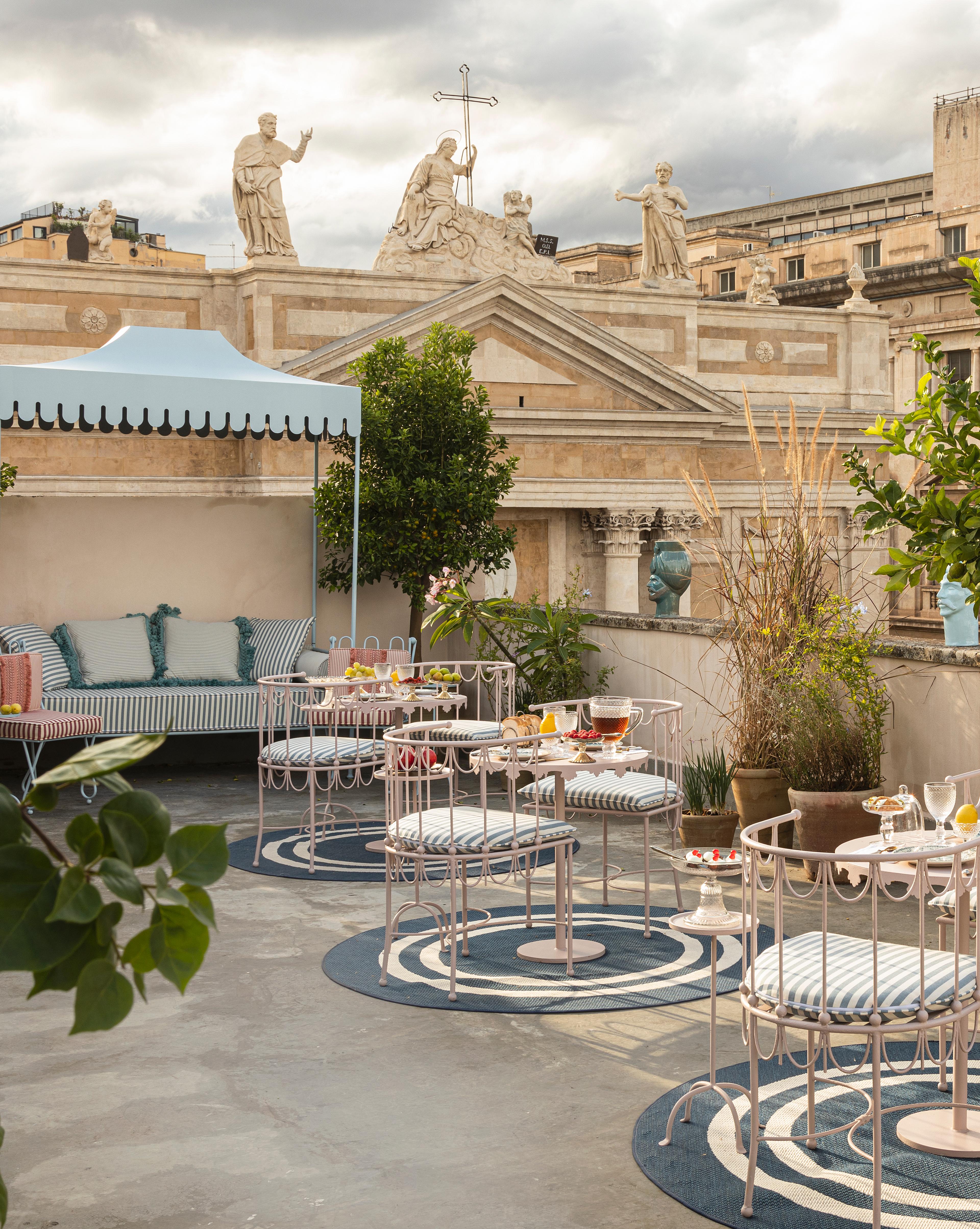 Al di sopra di tutto questo si trova il giardino pensile, una terrazza appartata con vista panoramica sui tetti e sulle rovine. Da qui si vede l'anfiteatro romano, vicino e senza tempo. È uno spazio per fare colazione, riflettere o semplicemente per lasciarsi avvolgere dalla luce e dall'aria della Sicilia.