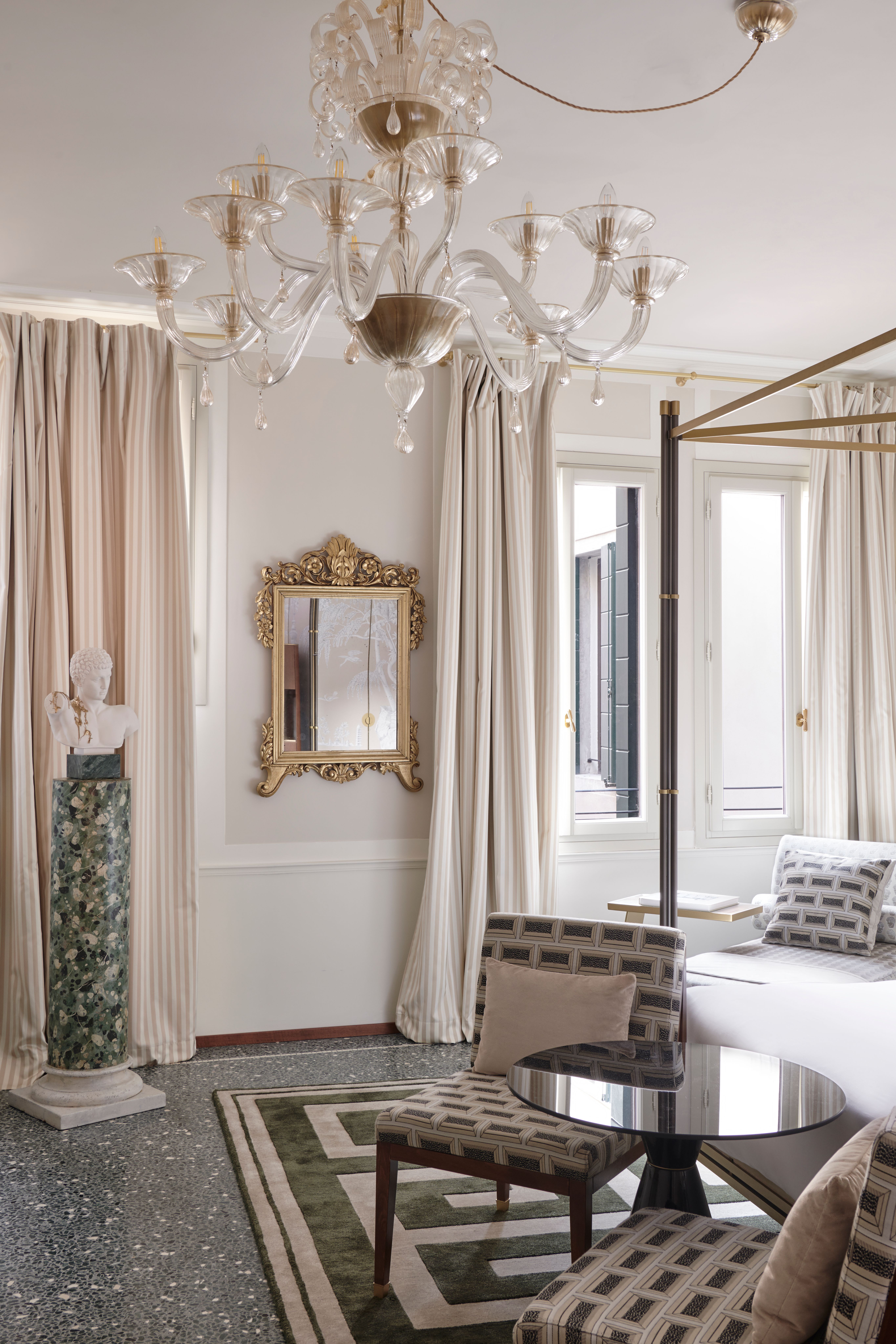 L'hotel vanta un'eccezionale maestria nei tessuti, nei vetri e nei pavimenti, con dettagli come i pavimenti originali in seminato veneziano realizzati a mano da una delle più antiche famiglie di artigiani ancora in attività. Il design unisce i contributi dei maestri artigiani di Venezia e della Toscana, sottolineando la dedizione dell'hotel alla sostenibilità attraverso la scelta di pezzi di produzione locale destinati a durare nel tempo. Ogni tessuto, arredo e capolavoro in vetro di Murano riflette l'impegno per la qualità e l'atemporalità, combinando le tecniche tradizionali con l'eleganza contemporanea.