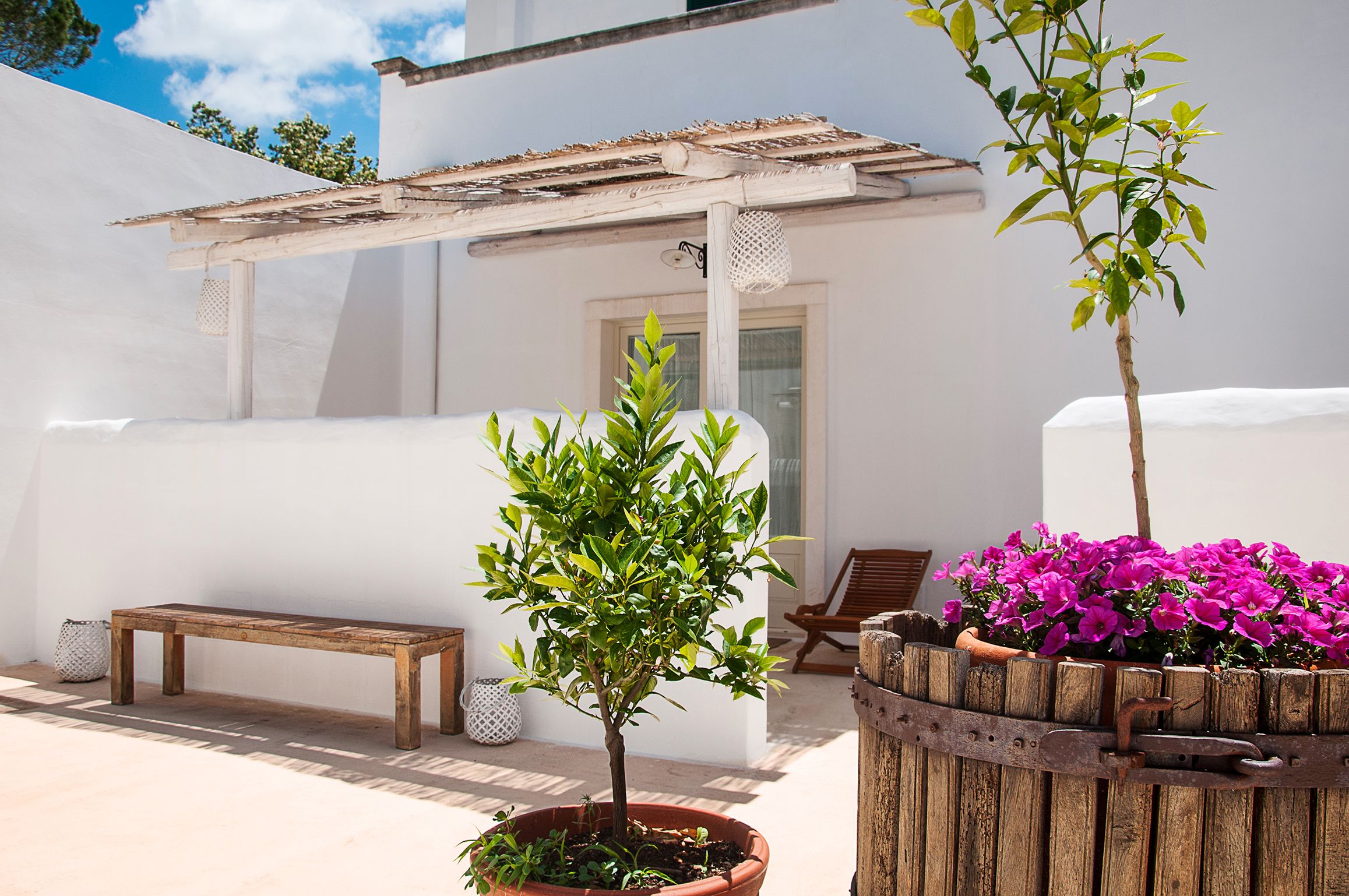 Gli interni e gli esterni della masseria riflettono un mix tra il rustico e il moderno. Il patio vi accoglie con il verde del giardino, con il suo gioco di luci e ombre, una zona perfetta per rilassarsi e leggere. Dal patio si estende la piscina che spicca nel giardino ben curato.