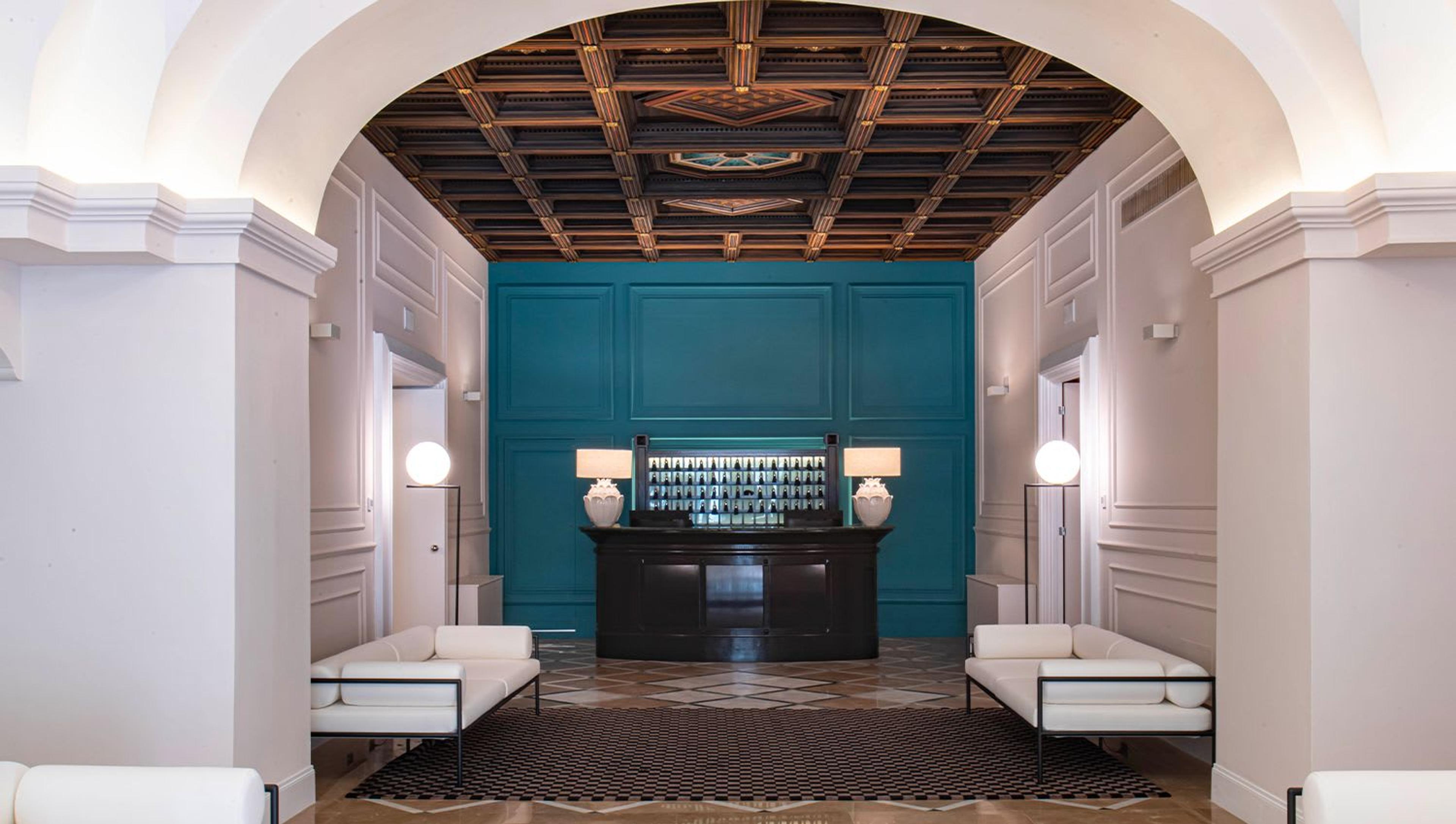 Lo stile classico ed elegante dell'architettura esterna si fonde con gli interni moderni e sobri, caratterizzati da un design lussuoso ma pulito per sottolineare gli splendidi dettagli costruttivi dell'edificio. Autentici soffitti a cassettoni in legno intagliato si riflettono sui pavimenti in marmo antico, ricchi di decorazioni e magistralmente restaurati. Le vetrate, finemente decorate con motivi floreali colorati, richiamano lo stile barocco e, allo stesso tempo, il patrimonio artistico e classico del palazzo è stato arricchito con nuovi dettagli da designer italiani e artigiani locali.