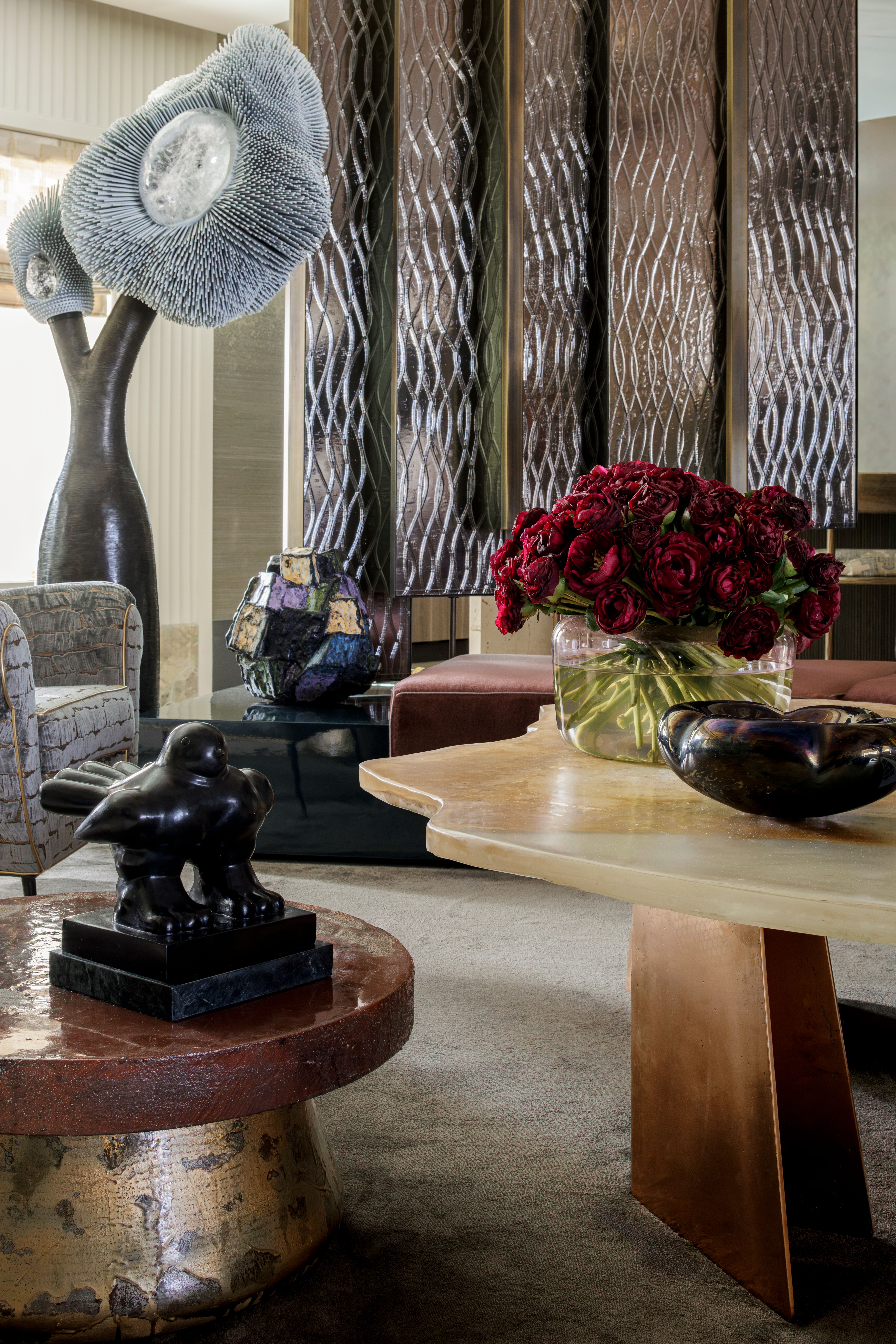 Nella realizzazione di questo spazio dal respiro cosmopolita, Artemest ha collaborato con Wecselman fornendo una selezione di pezzi di artigianato italiano che si integrano naturalmente nella sua visione. Tavoli scultorei e oggetti decorativi arricchiscono il dialogo tra materiali – dai metalli e specchi alla pietra e al legno – senza mai togliere il carattere vissuto e personale della stanza. L’incontro tra questi elementi artigianali e i pezzi contemporanei rafforza l’eleganza senza tempo che caratterizza l’approccio di Wecselman.