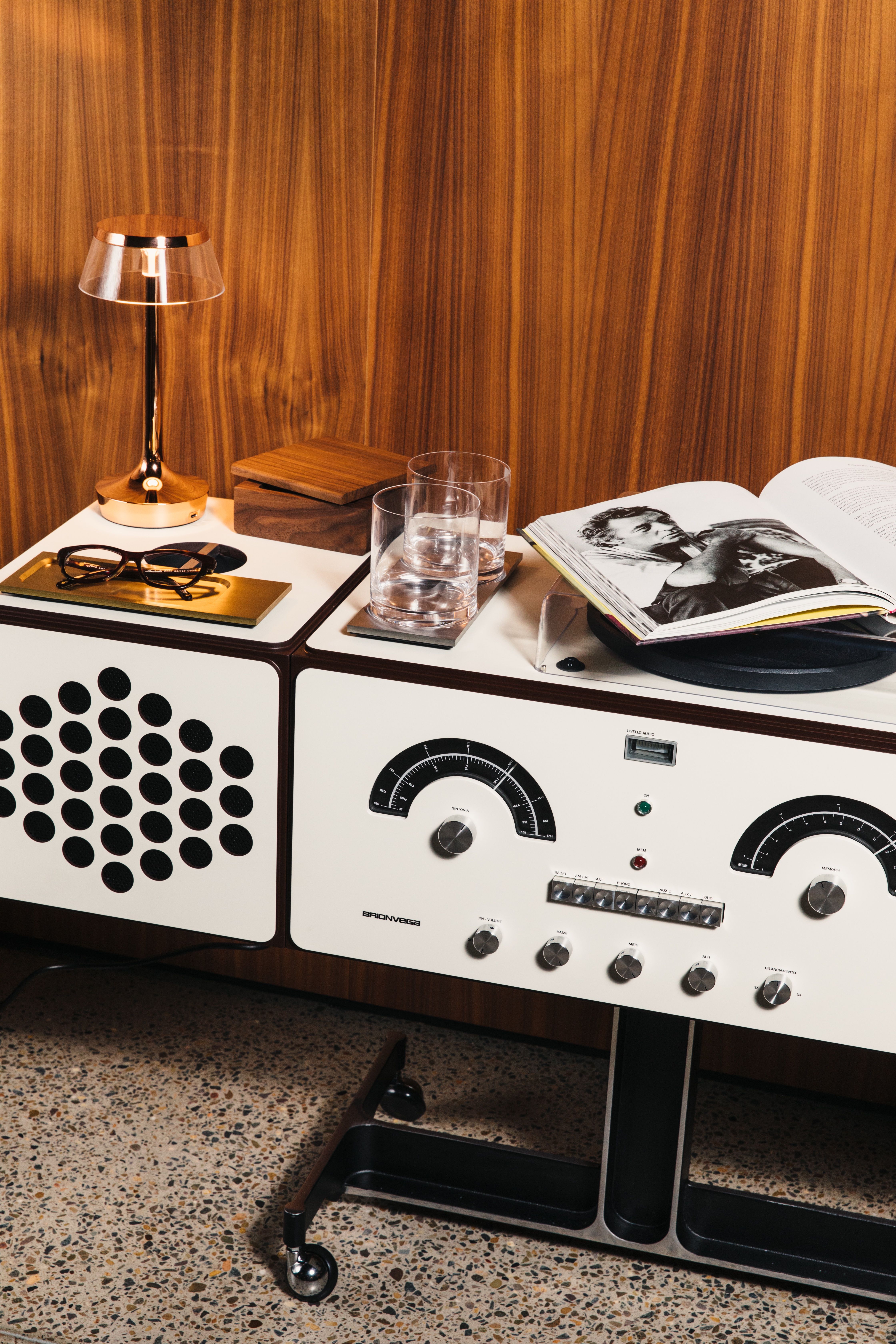 Oggetti che, per la loro importanza non solo estetica, ma anche e soprattutto culturale l’azienda ha deciso oggi di riproporre mantenendo inalterati i concetti che già al tempo ne avevano rappresentato l’unicità ed il successo. Questo infatti è il motivo per cui la produzione del radiofonografo e del totem , ad esempio, non solo rispetta i disegni ed i materiali del progetto originale, ma segue anche un processo produttivo di tipo artigianale capace di coinvolgere più maestranze presenti nel territorio del nord est italiano.