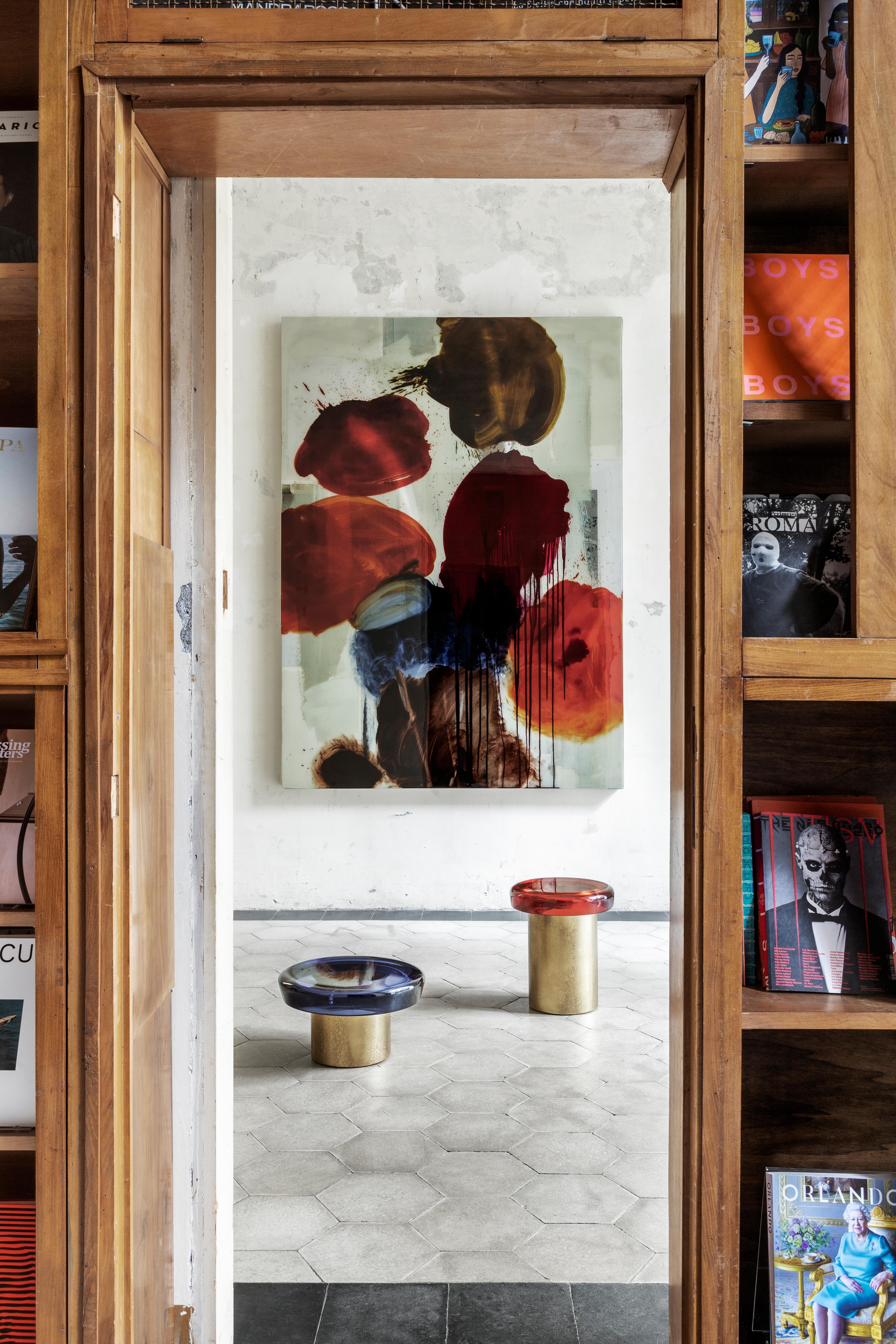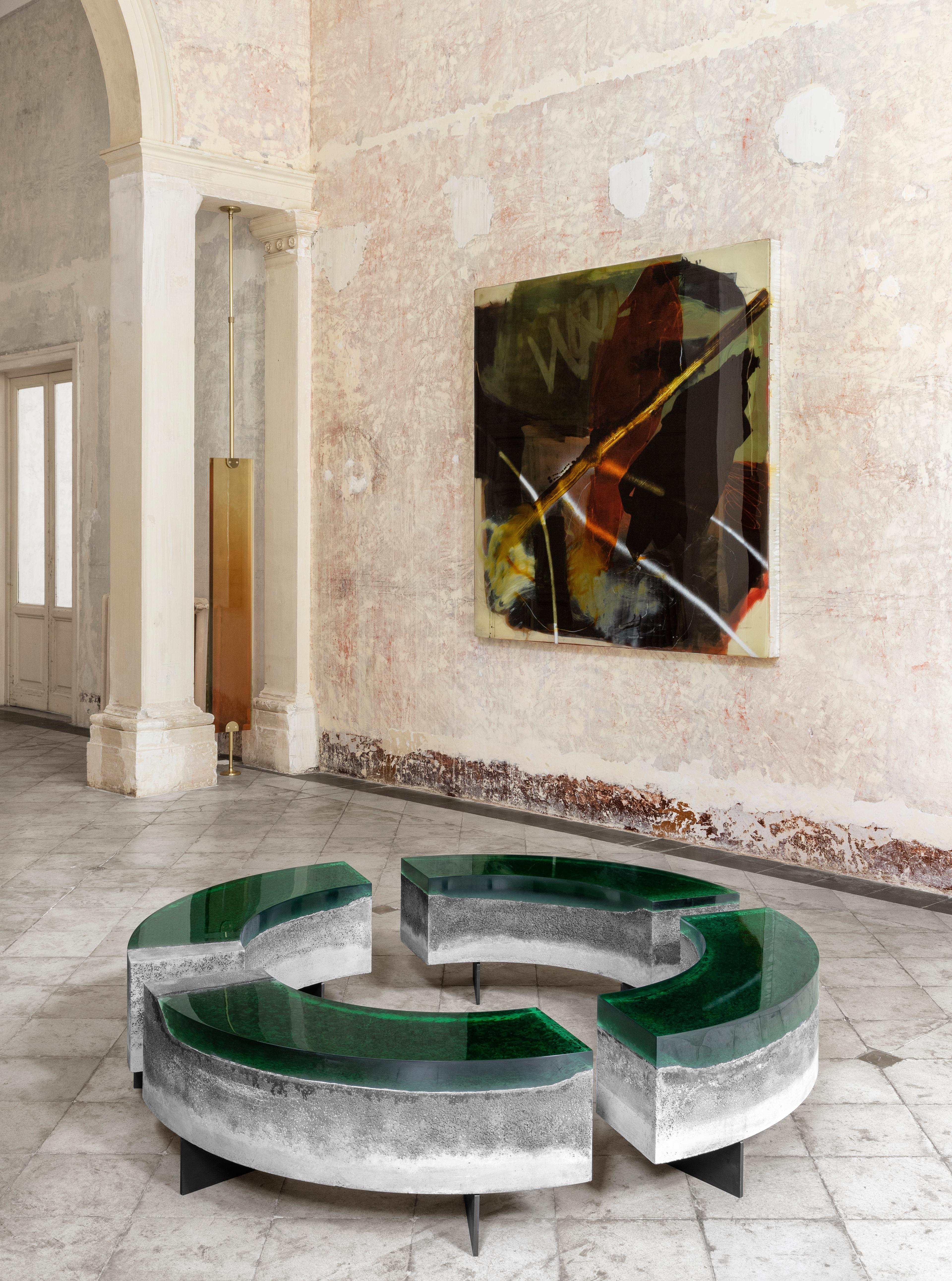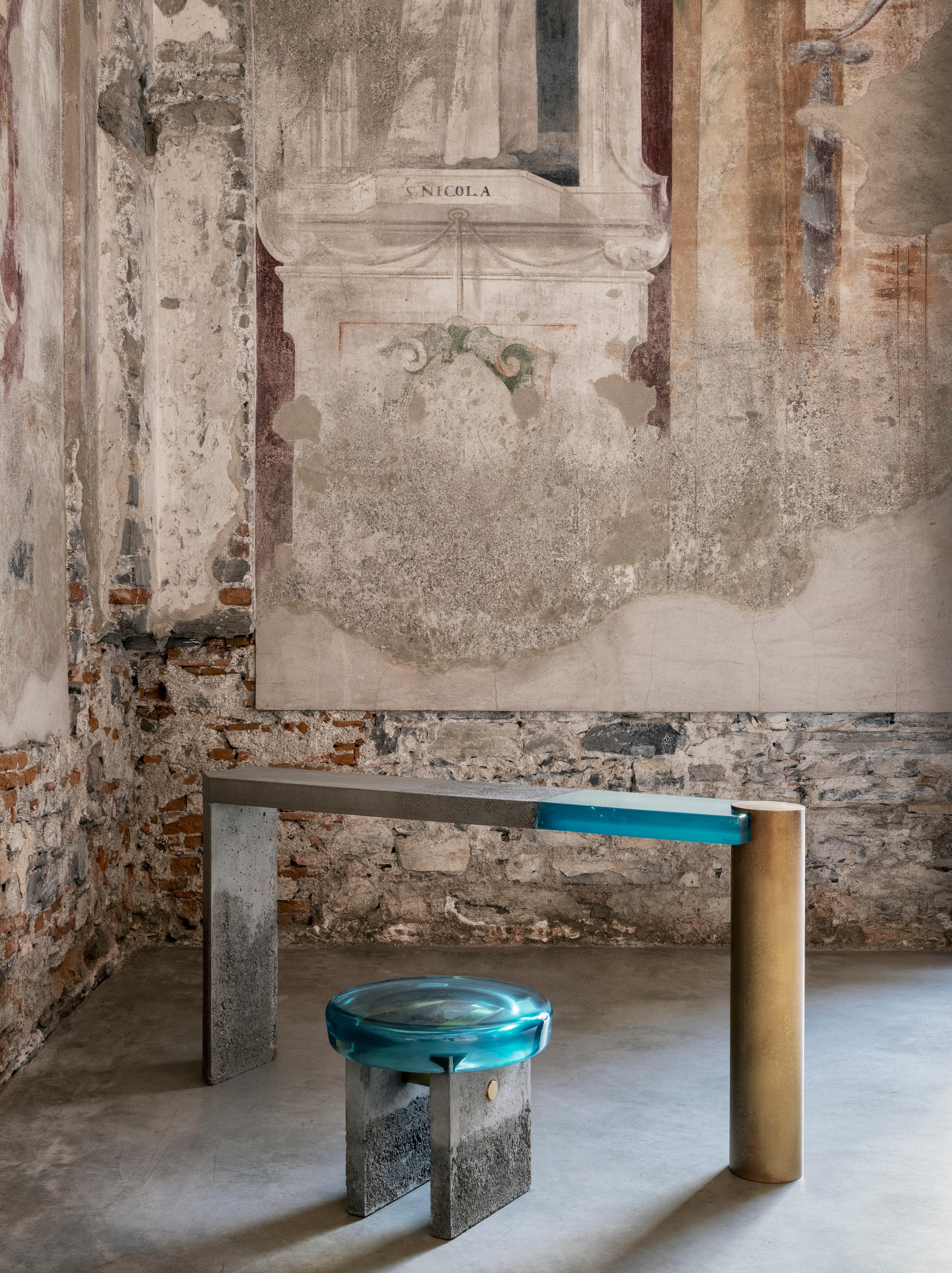 Siamo stati subito affascinati dalla resina, un materiale imprevedibile che ci offre una notevole libertà di espressione, sia in termini di colore che di forma. Nel corso del tempo, il nostro uso della resina si è evoluto: inizialmente veniva applicata come rivestimento superficiale, poi abbiamo iniziato a colarla in stampi per creare forme tridimensionali. Abbiamo sperimentato a lungo nel nostro laboratorio di Como per capire come "addomesticarla". Questo ci ha portato a esplorare la combinazione di resina e calcestruzzo, fondendo i due materiali così diversi in un unico stampo. Di recente, abbiamo approfondito la lavorazione della Lucite, una resina acrilica che richiede un approccio completamente diverso rispetto alla resina epossidica.
