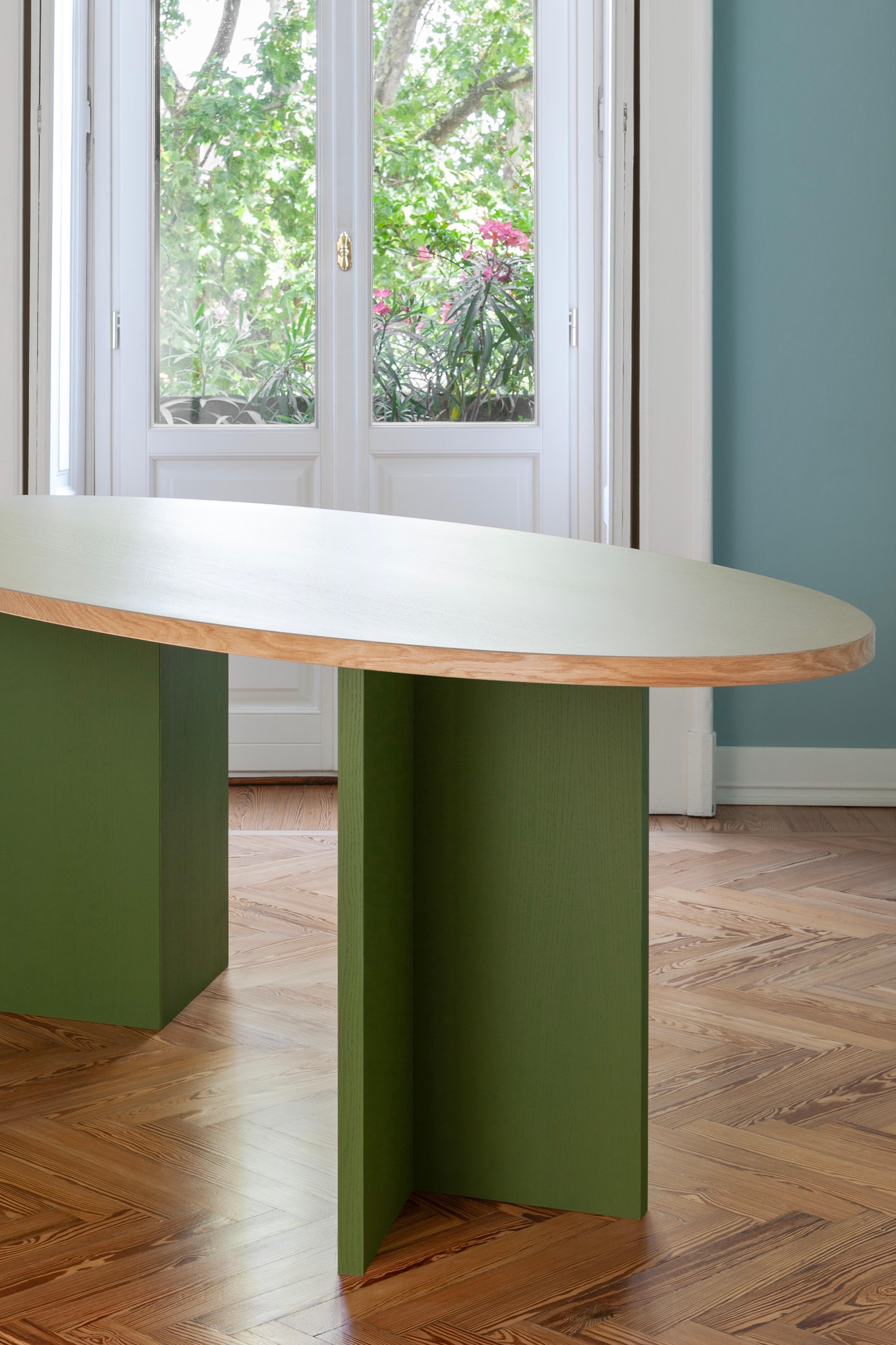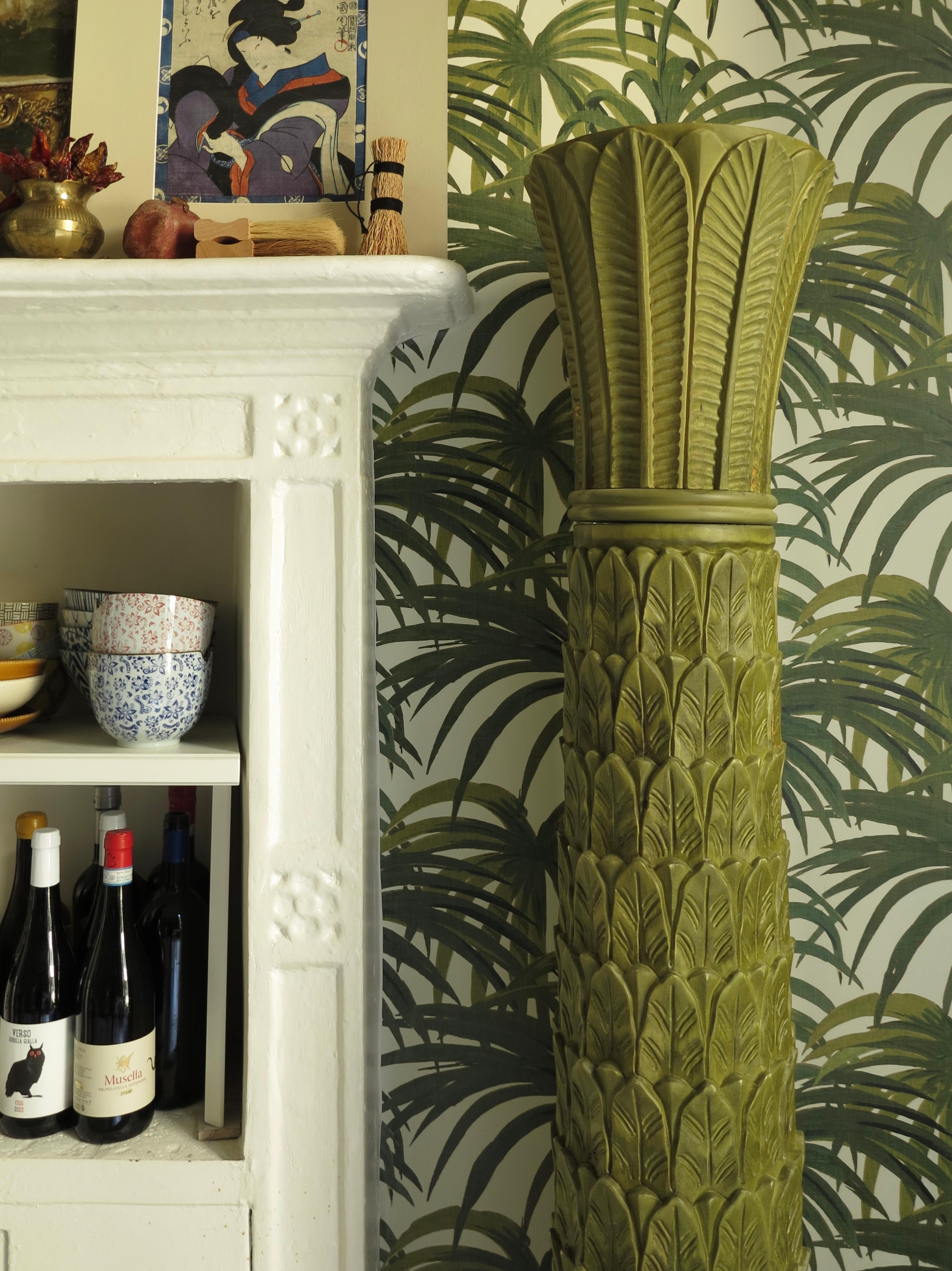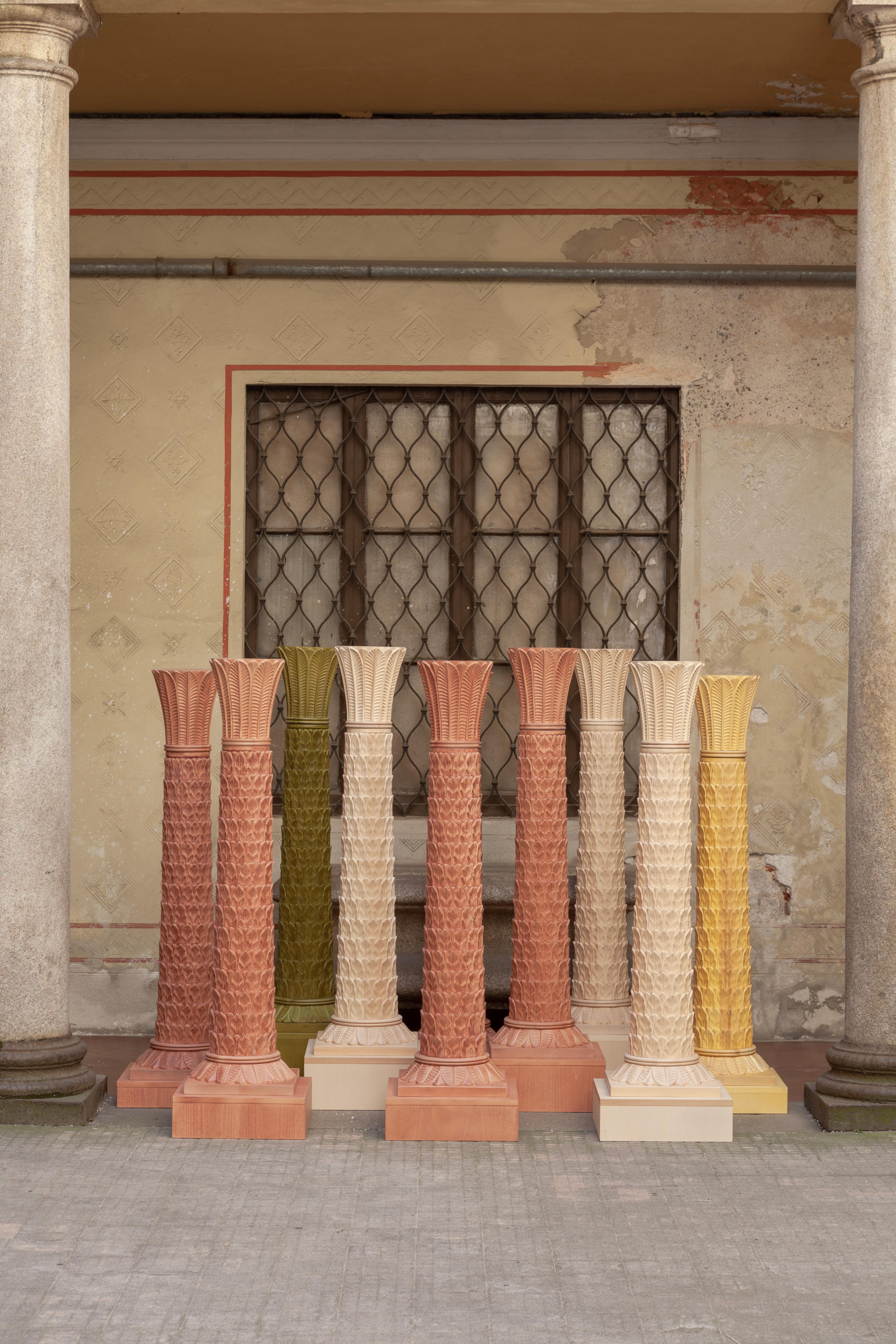 L’idea della colonna Anne è nata scorrendo un album di famiglia con vecchie foto in bianco e nero degli anni 30/40: in un salotto Art Deco c’erano due imponenti colonne ai lati di una porta. Abbiamo quindi riflettuto su questo elemento architettonico e decorativo e della sua onnipresenza nell’architettura, dall’antico Egitto (a cui ci siamo ispirati per il decoro Palmette) ai giorni nostri e di come riesca a donare maestosità a qualsiasi ambiente. Ci piaceva l’idea di crearne una che potesse essere inserita in qualsiasi ambiente ed abbiamo studiato come farla con uno dei nostri artigiani; la prima è stata interamente intagliata a mano, e ci sono voluti 2 mesi! Abbiamo quindi cercato una soluzione più efficiente in termini di tempi e costi: il tiglio massello viene prima assemblato nella forma della colonna e posto su un macchinario che ne traccia il disegno decorativo, che è poi rifinito con un intaglio a mano. Questo ultimo passaggio, che impiega una settimana per colonna, è fondamentale per dare profondità ed “anima” all’oggetto e donargli quell’unicità che solo i prodotti con tocco artigianale hanno. I mordenti colorati vengono poi applicati a mano con una panno per rendere l’effetto opaco e sbiadito.
