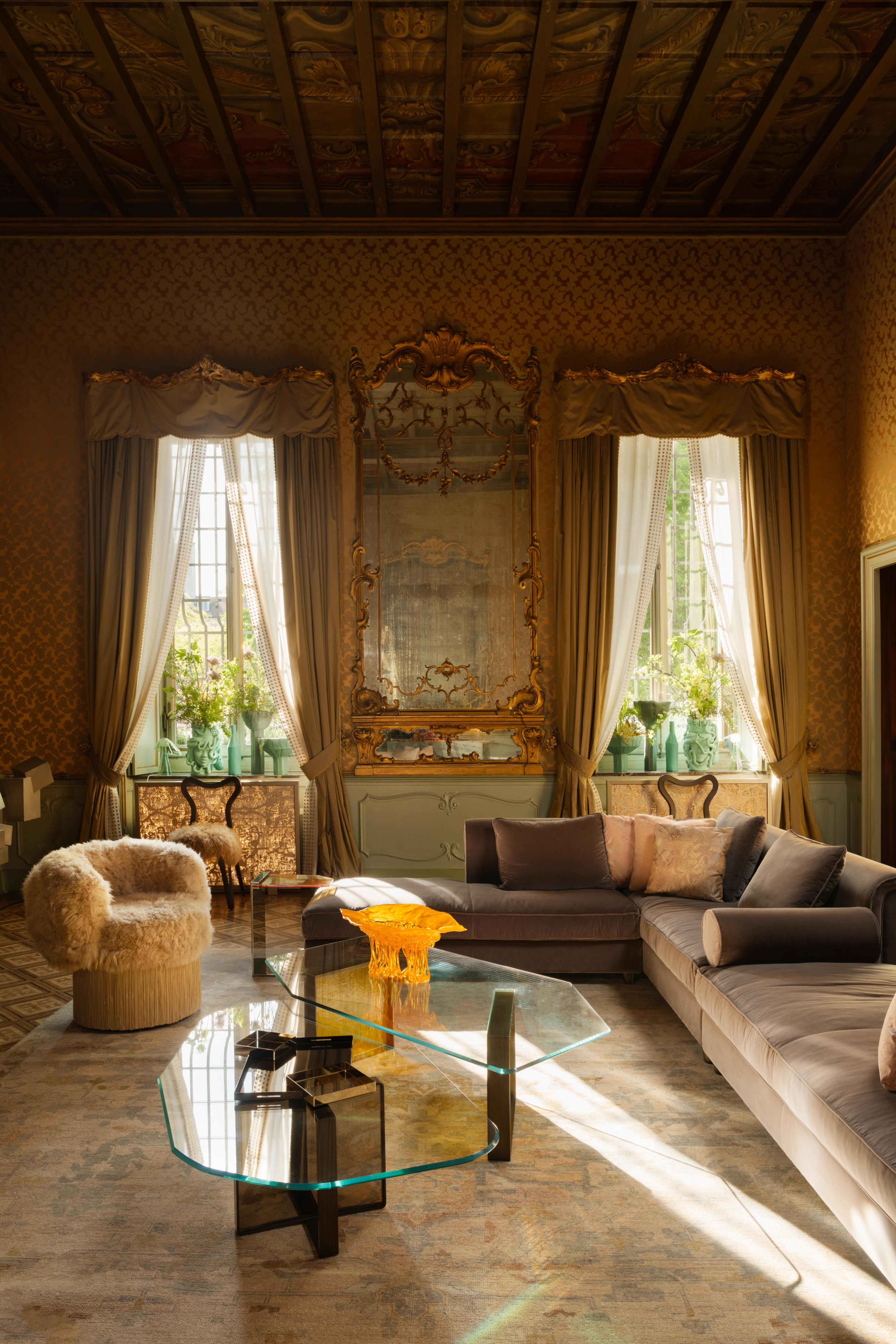 The Living Room of L’Appartamento is a classical space adorned with gilded walls, parquet floors, and high wainscots. Embracing the warm hues of the wood floors, adorned walls with golden silk brocade fabric, and celadon green accents Rottet Studio chose to further enhance the color palette: hand-cast amber-colored glass coffee tables, green marble consoles, a salmon pink sofa and chairs, and dichroic glass tables that reflect all hues and light are just some of the furniture pieces that have been carefully selected for visitors to admire upon entering the living room.