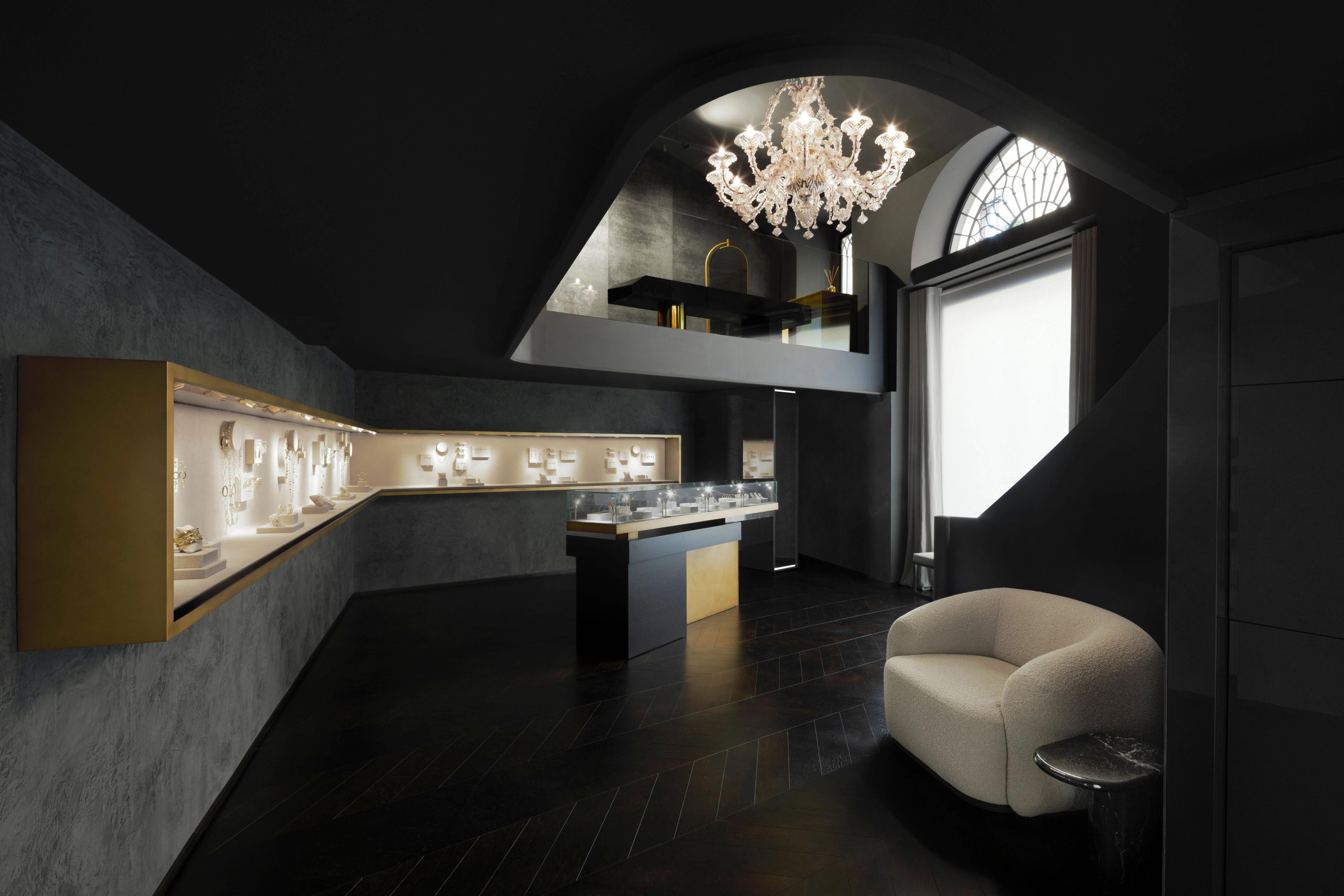 The Madison Ave Flagship Store in New York follows a different design thought. The dark colors leave space for wood details and light colored furniture. Lighting takes center stage giving relevance to the showcased jewellry.