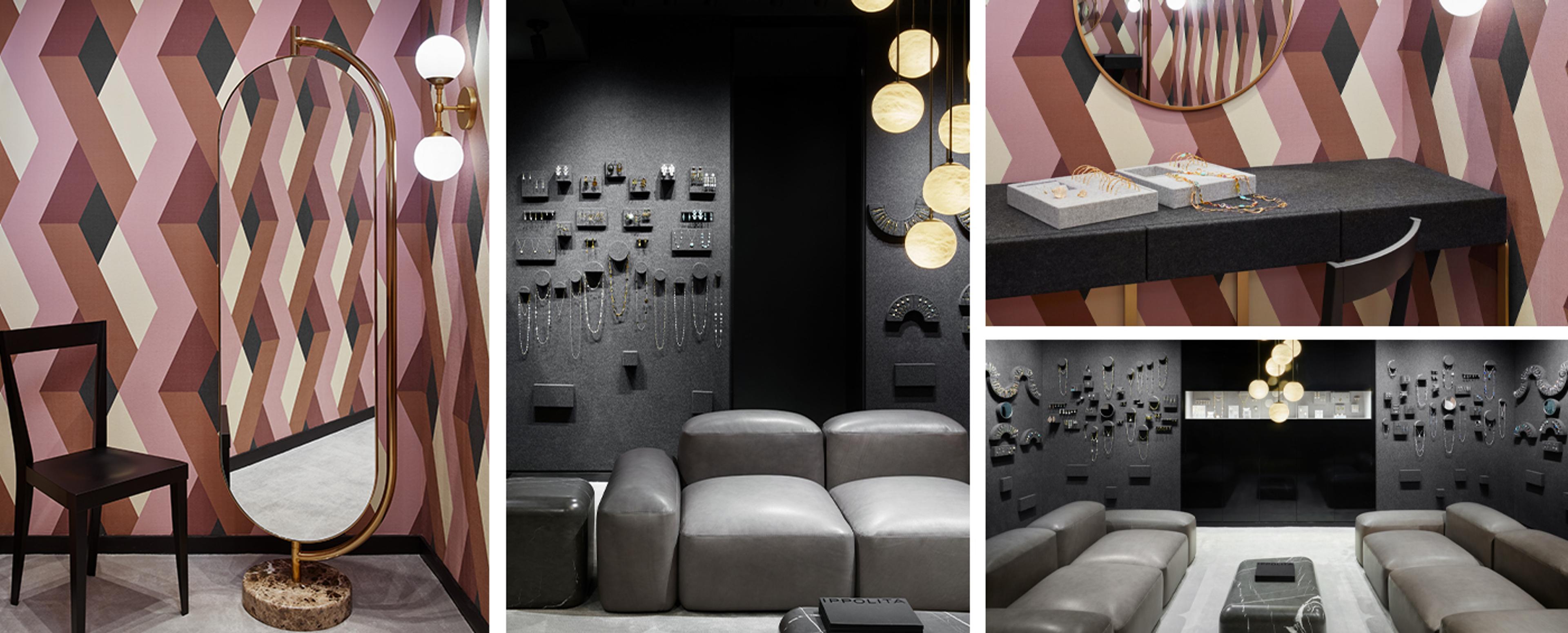 For the Ippolita boutique in Chicago the choice of color and furniture follow the same concept of the Milan location, with darkness being protagonist to prominently feature the gorgeous jewelry pieces. However, in a more private space, the chevron and colored wall is a great contrast with golden and black details.