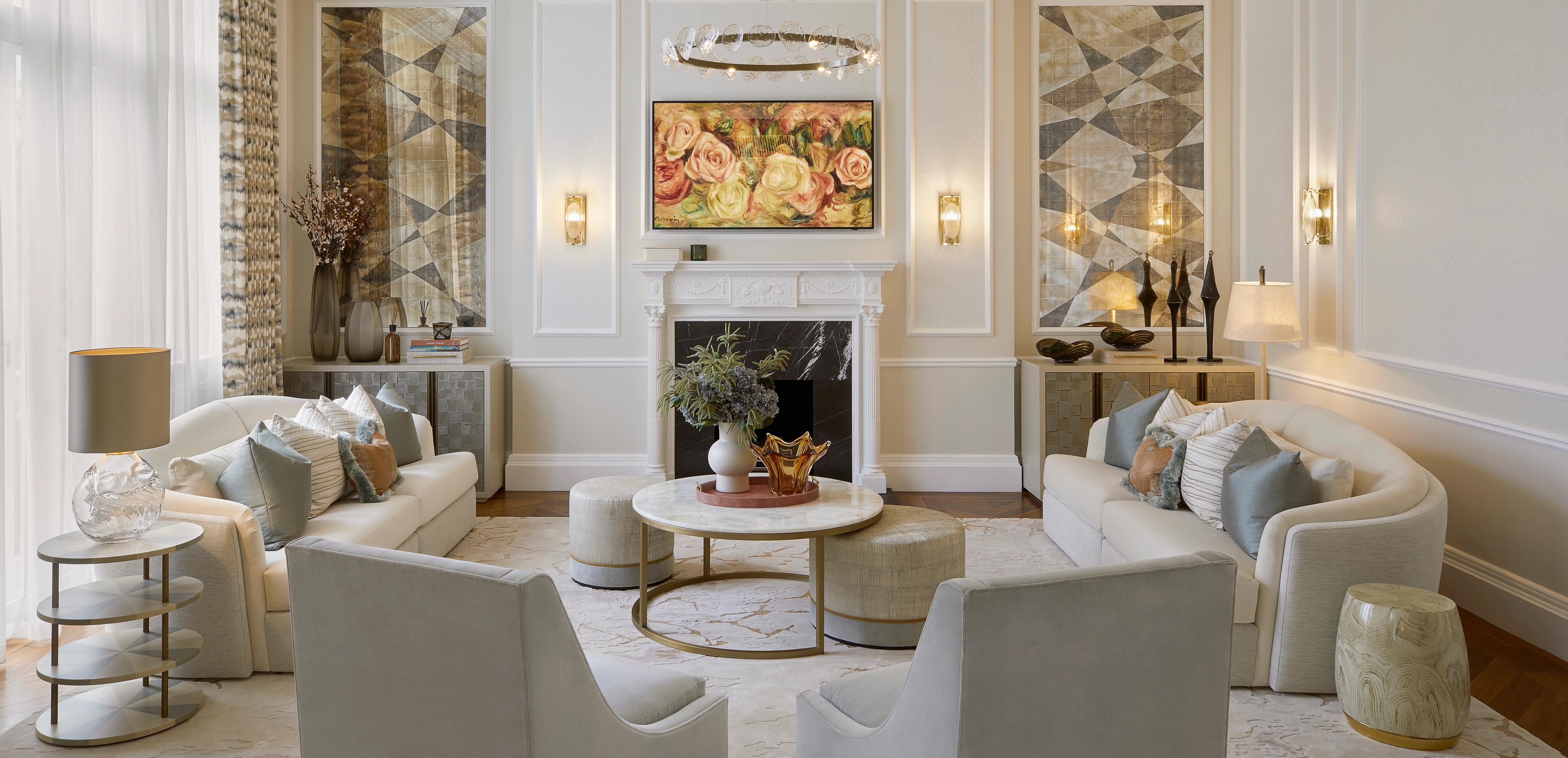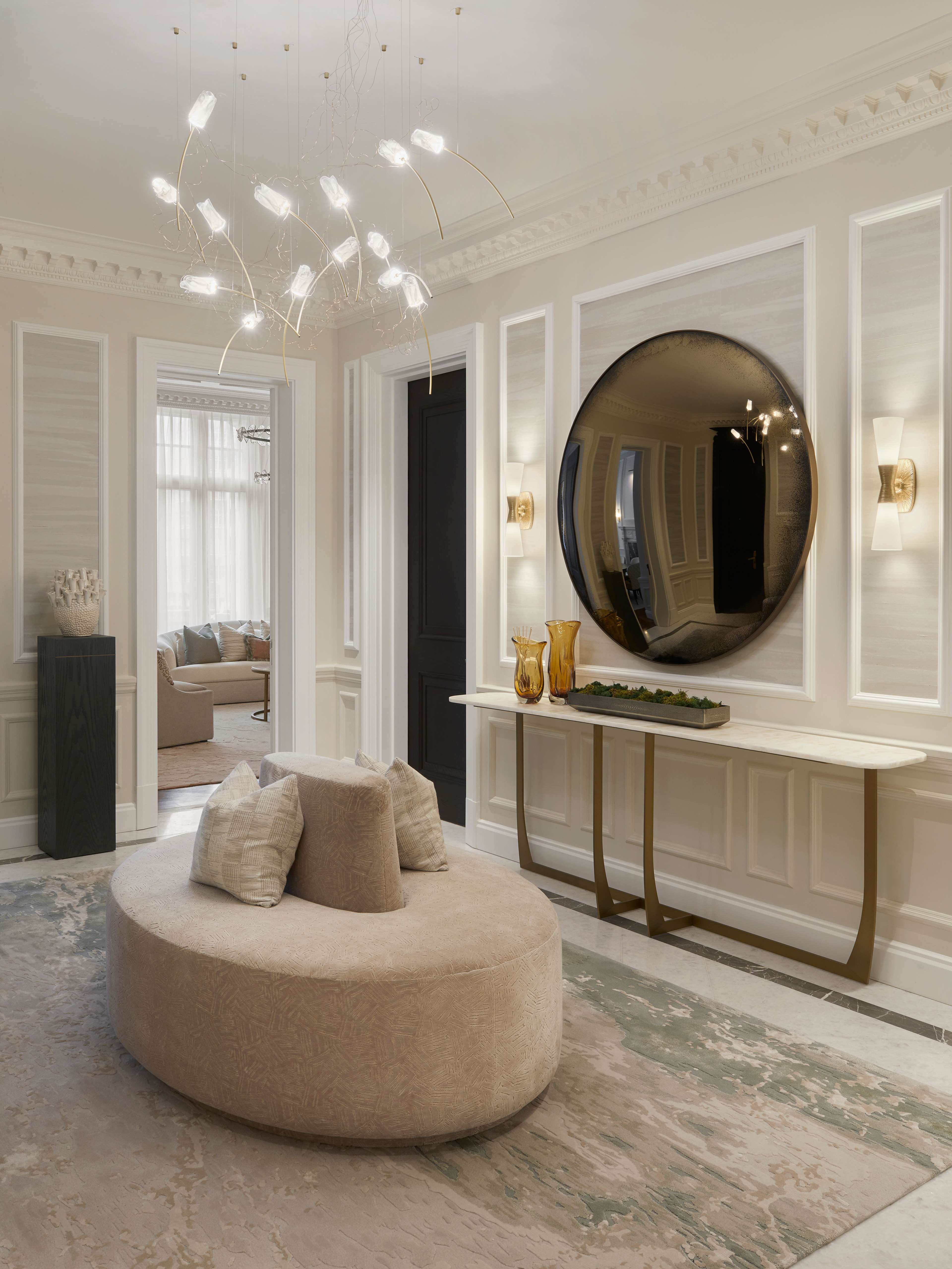 Il progetto di ristrutturazione degli interni dell'appartamento di Harcourt House ha comportato la completa trasformazione di uno spazio di 185 metri quadrati. Il progetto prevedeva una parziale ristrutturazione dell'appartamento e l'inserimento di finiture e materiali di alto livello, come carte da parati in seta dipinte a mano, arredi artigianali personalizzati e illuminazione su misura. La combinazione di colori è stata scelta con cura per creare un'atmosfera calda e invitante, mettendo al contempo in risalto le caratteristiche architettoniche dello spazio. Il risultato finale è una casa lussuosa ed elegante che riflette lo stile e il gusto personale dei clienti, incorporando al contempo il fascino unico dell'edificio di Harcourt House.