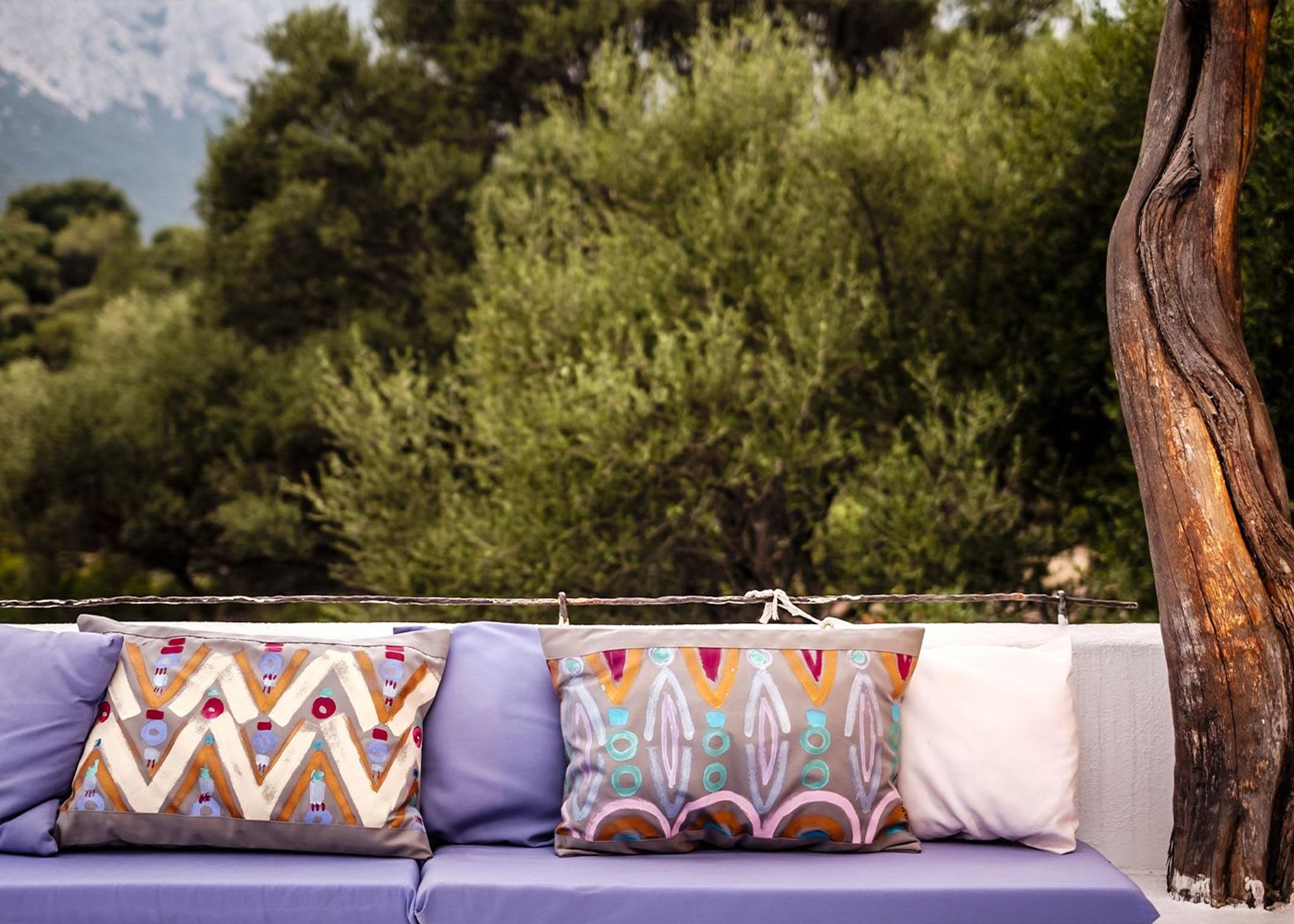The interiors of the hotel are deeply influenced by Sardinian artisanal specialties and crafts, and Giovanna Palimone has masterfully translated these traditions into her own line of handmade and hand painted cushions with the traditional embroidery techniques of the area, Le Botteghe Su Gologone. Playing with color, textures and raw materials such as cotton and linen, the interiors of the hotel are an explosion of color and natural pigments all around.