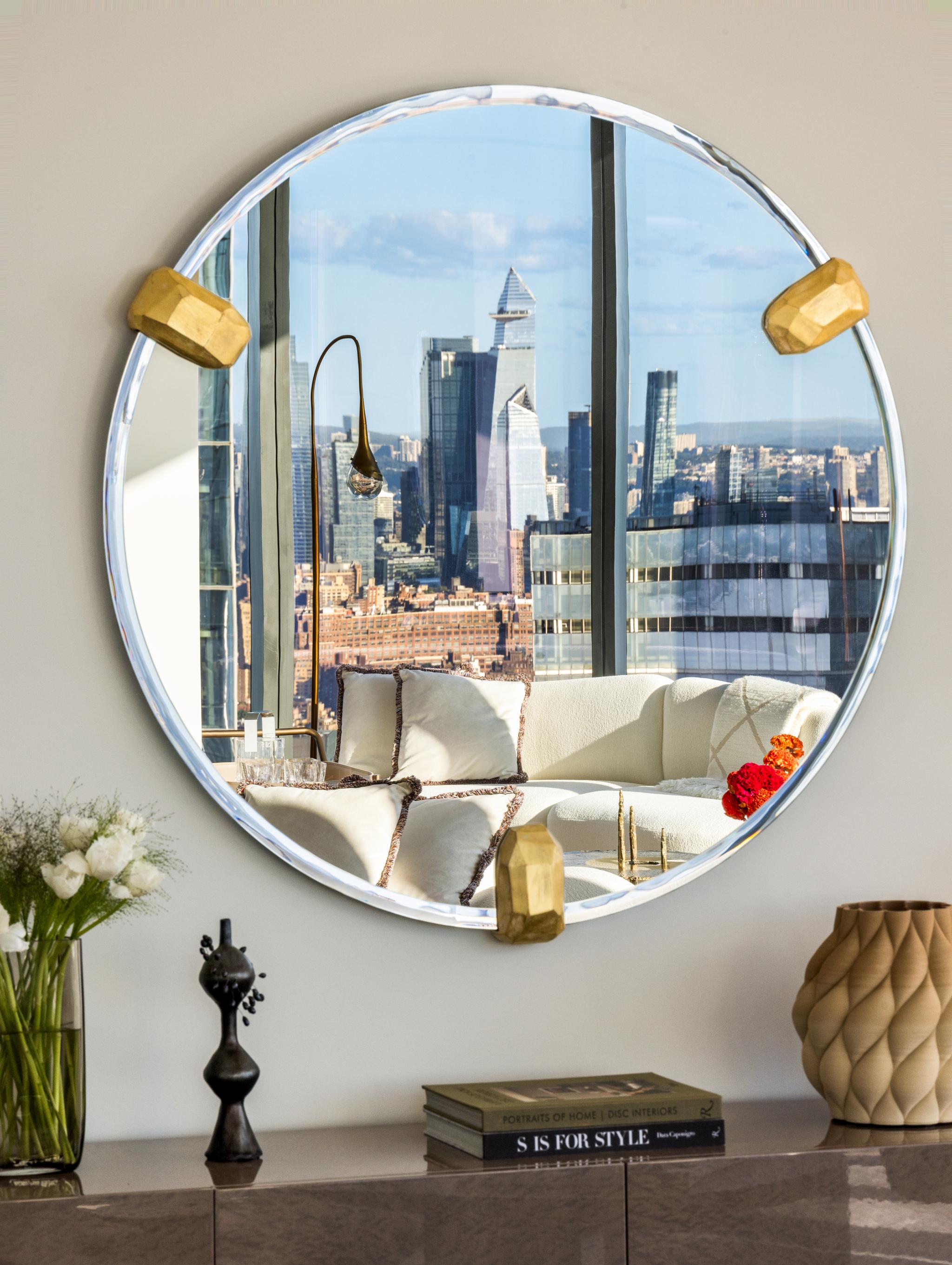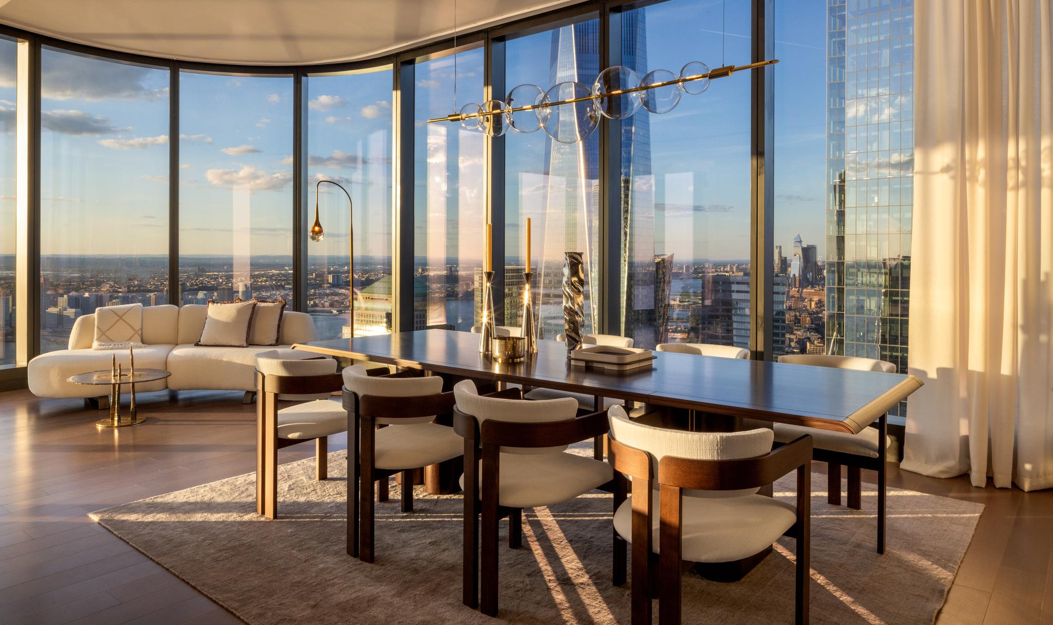 The penthouse’s interiors draw inspiration from the tower’s curved architectural form and views of the Hudson River, Statue of Liberty, World Trade Center, and the NYC Skyline. The living room, with its floor-to-ceiling windows, offers breathtaking vistas framed by a sculptural sofa in soft white, evoking a sense of being among the clouds. Complementary pieces, such as a glossy bird's-eye maple sideboard and a Canaletto wood bookcase, add texture and depth to the modern aesthetic. In the dining area, a walnut table with sculptural legs is paired with a floating brass chandelier, creating a sophisticated yet inviting atmosphere. Each bedroom serves as a serene retreat adorned with custom Italian furnishings and artisanal details, including Murano glass and monolithic sculptures. The lighting throughout the penthouse, both functional and atmospheric, enhances the serene ambiance, providing a perfect retreat from the bustling city below.