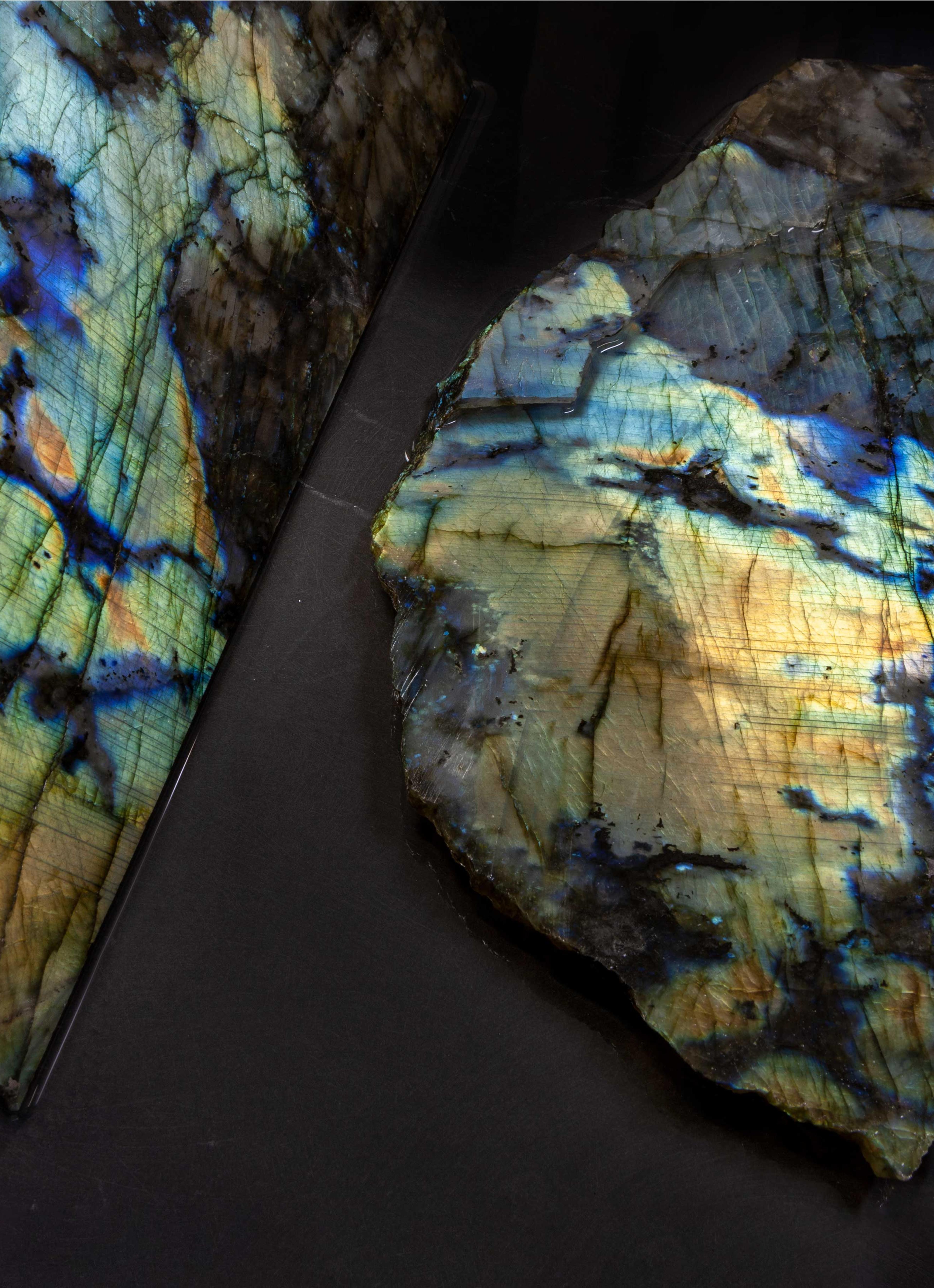 Senza alcun dubbio posso dire che la mia pietra preferita è sicuramente la labradorite, poiché è una delle poche che ancora oggi, ogni volta che la vedo, riesce a trasmettermi sensazioni uniche indescrivibili. La caratteristica principale di questo splendido materiale è il fenomeno ottico della “labradorescenza”; esso si presenta come uno scintillio di lampi di colore azzurro, viola, verde, giallo e arancio. L'effetto si origina dall'interferenza dovuta alla presenza di vari strati laminari all'interno del minerale, questo fa sì che i colori si alternano e variano costantemente ogni qual volta l’osservatore si sposta e cambia la sua prospettiva. Questa pietra viene spesso lavorata a mosaico per esaltare al meglio le sue caratteristiche di variazione cromatiche. Molte sono le storie raccontate su di essa, ma quella che più riesce a spiegare al meglio le sue peculiarità è la famosa leggenda eschimese. Essa racconta che una volta l'aurora boreale fosse imprigionata nella roccia lungo la costa del Labrador, ma un guerriero errante eschimese, con dei colpi di lancia, liberò la maggior parte delle luci intrappolate nella roccia, mentre quelle che vi rimasero formarono la labradorite.