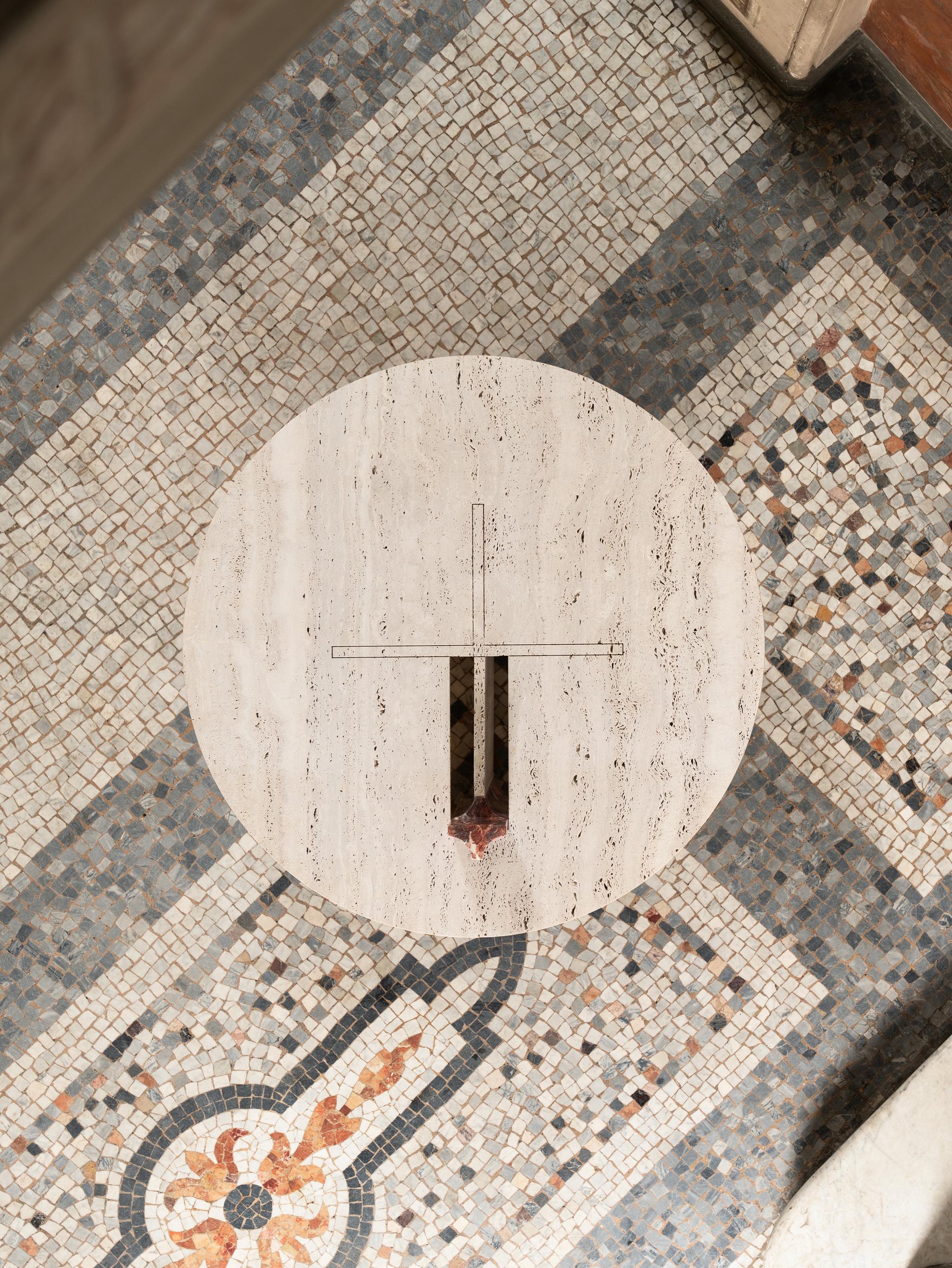 The travertine is left unfilled and cut parallel to its metamorphic veining, revealing its intrinsic structural design. In stark visual and tactile contrast, the Rosa Peralba marble is sculpted from solid blocks, shaped in the round, and hand-polished—transformed into a partially variable geometry, like a fragment of architecture that merges the ancient with the contemporary.