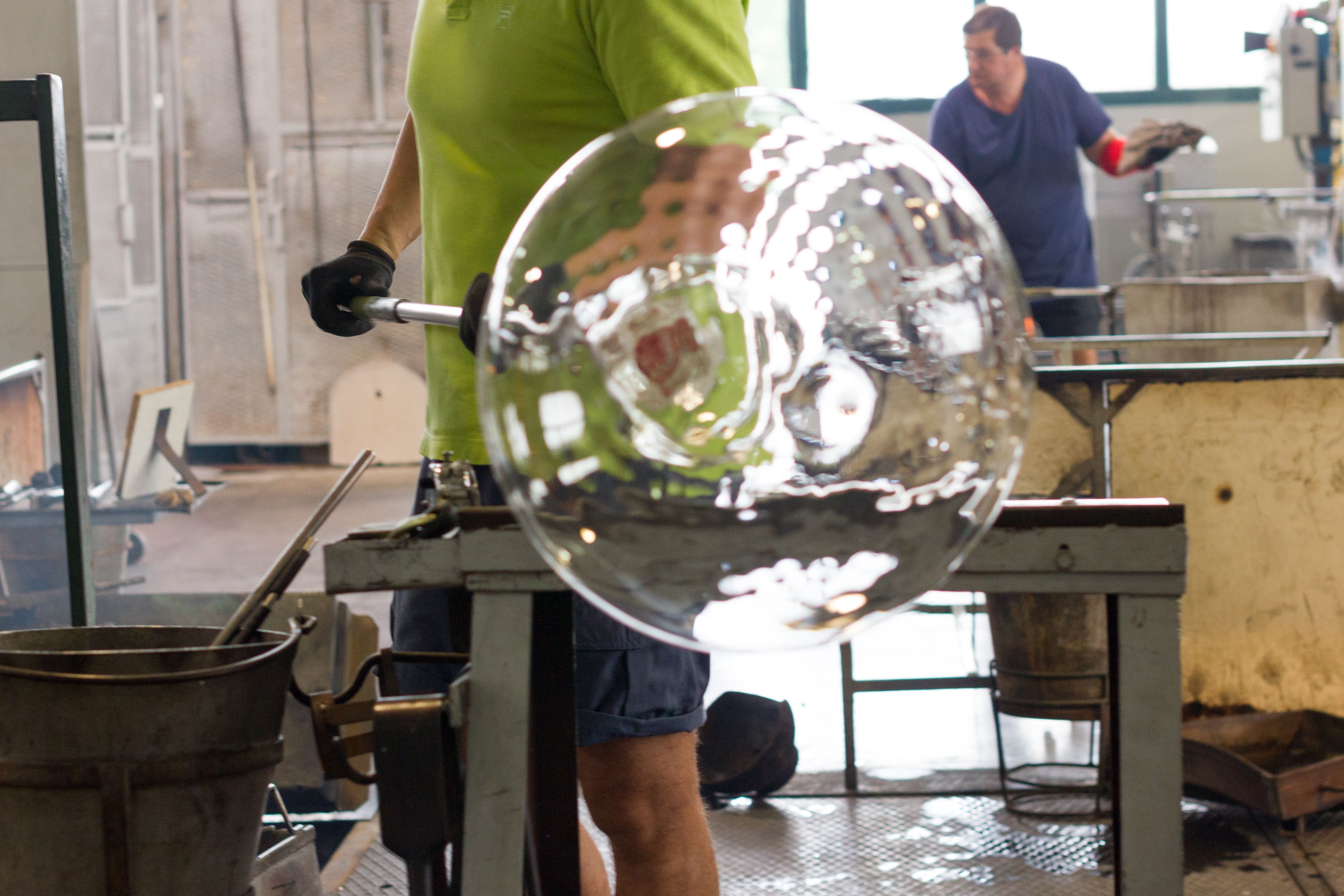 The first phase, important and yet not very well known, happens overnight and consists of the melting in kilns of a mix of minerals and sand. During the day, the master glassmakers work the mix. In order to create objects in mouth-blown glass from the kiln or crucible, a “portantino” gathers a drop-shaped piece of the mix with the edge of a blowing cane and works this piece of glass called “bolo”. Then he delivers it, still incandescent, to the master glassmaker who shapes it, depending on the type of object he is making.